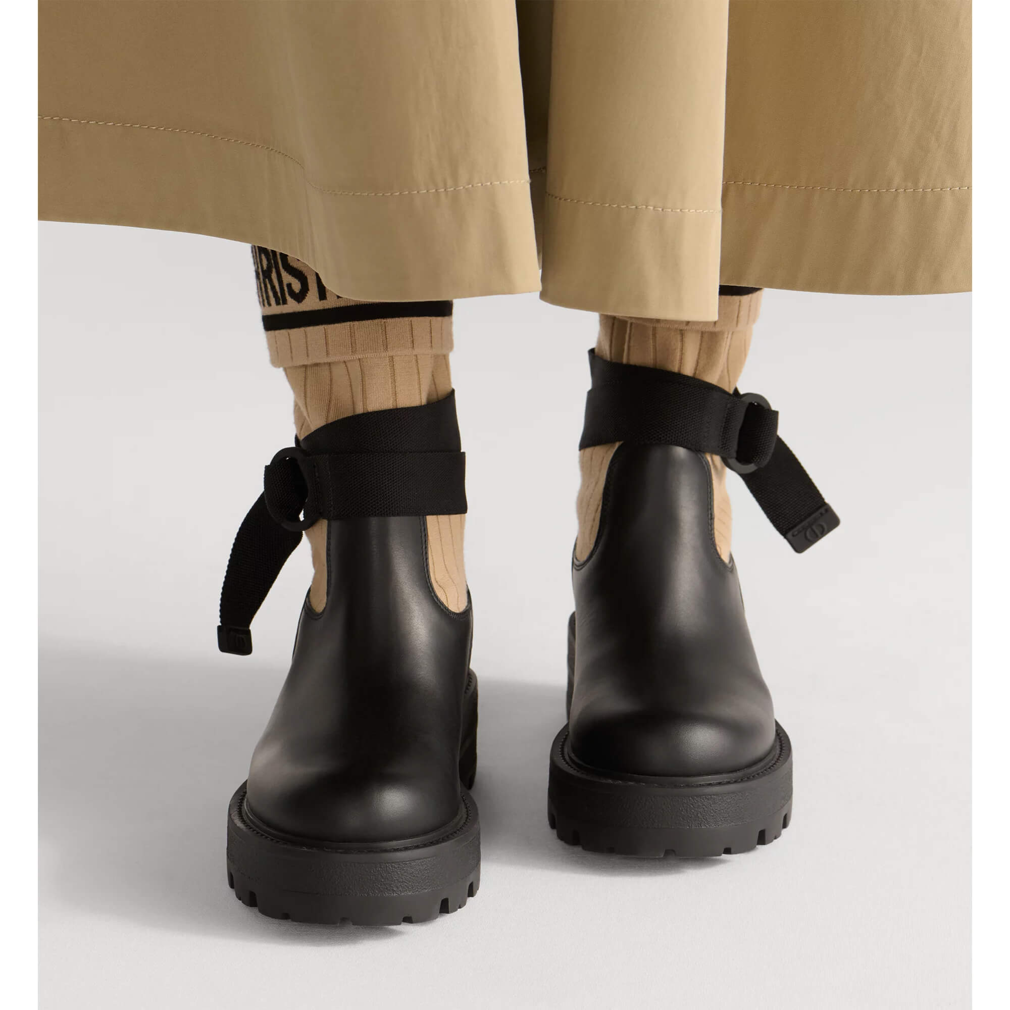 מגפיים מעור calfskin שחור בשילוב סריג טכני בצבע בז׳