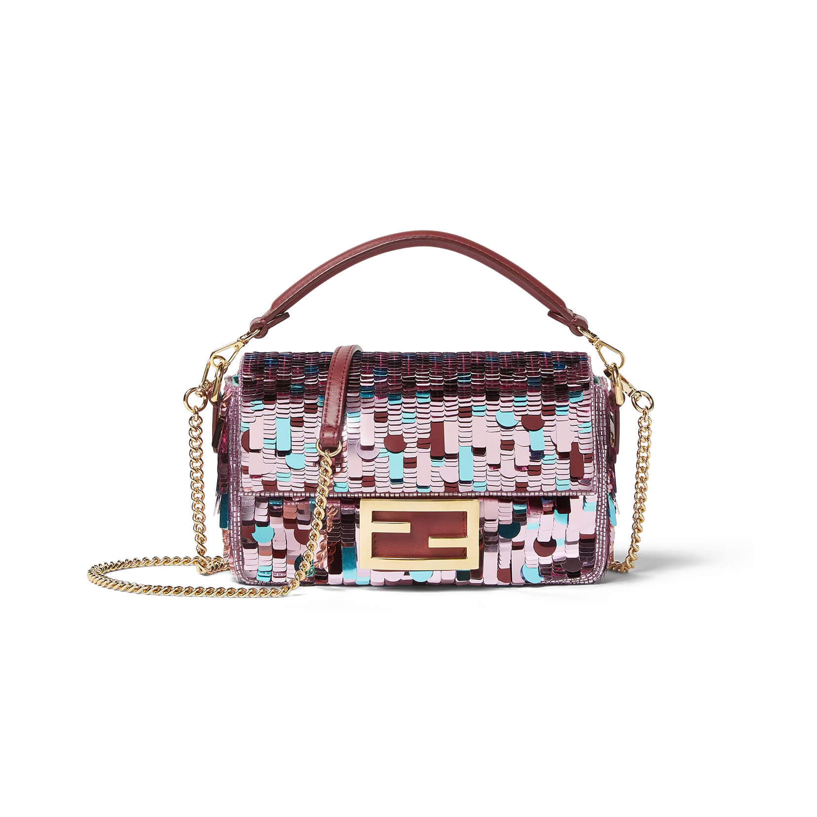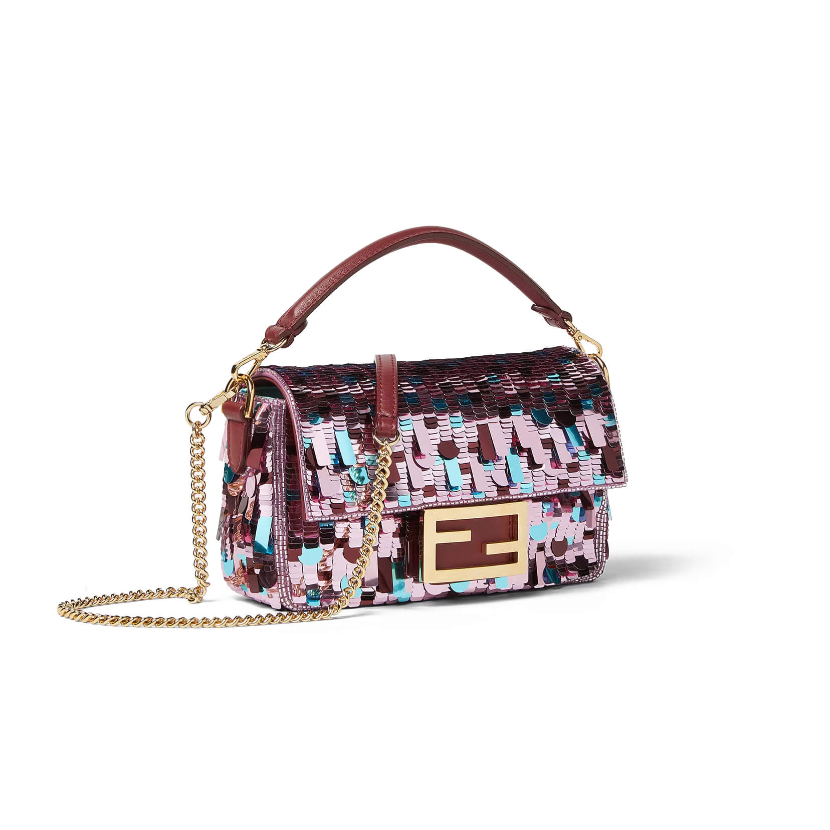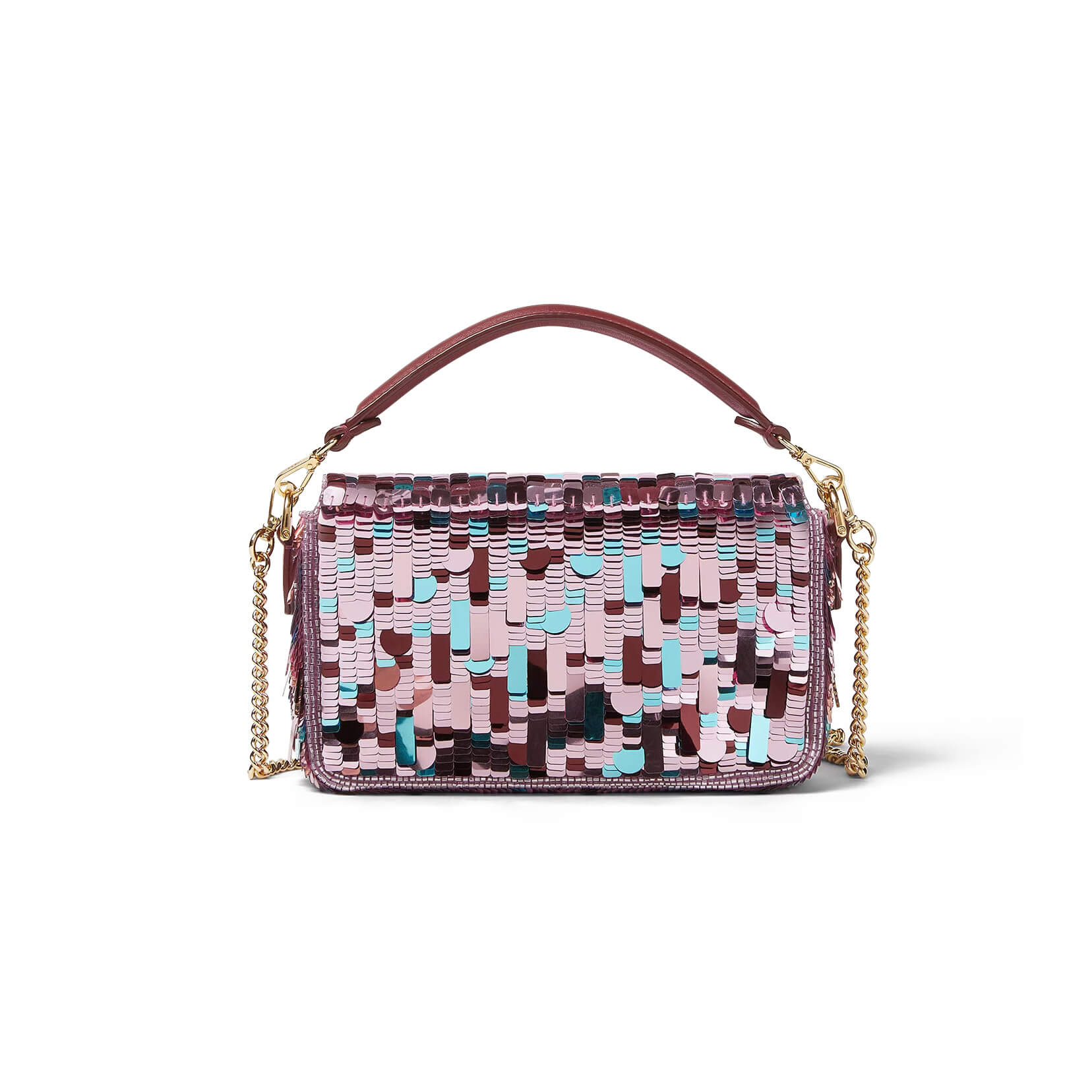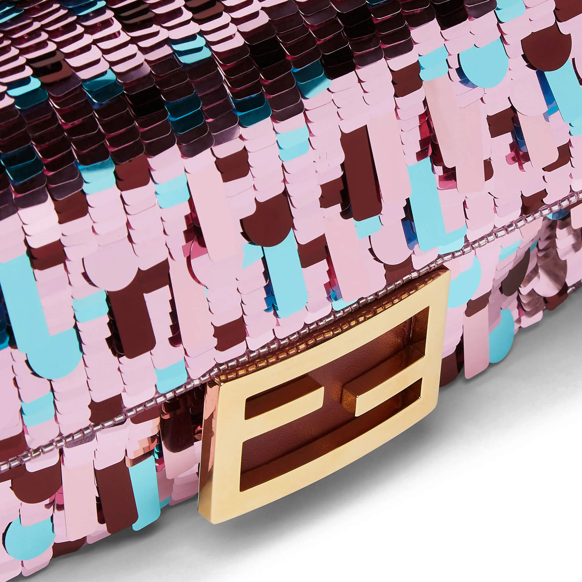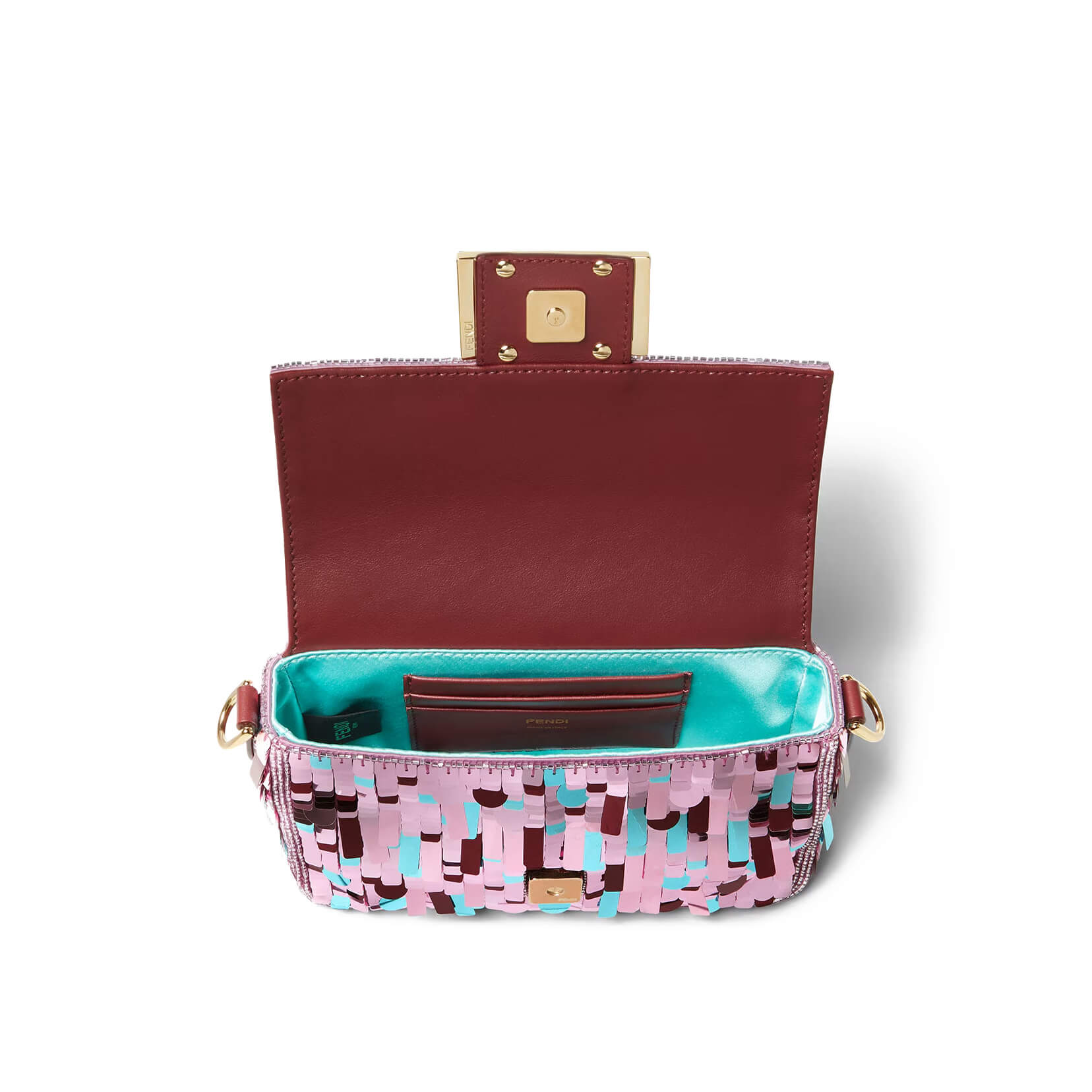 רקמת פאייטים צבעונית לכל אורכו בגווני ורוד, תכלת ובורדו ליצירת אפקט תלת־ממדי