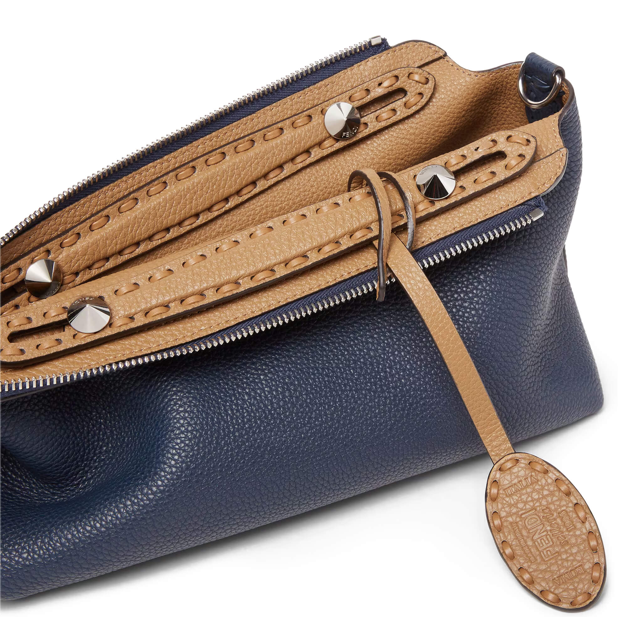 עשוי מעור Cuoio Romano בצבע כחול כהה והצד השני בצבע חום בהיר