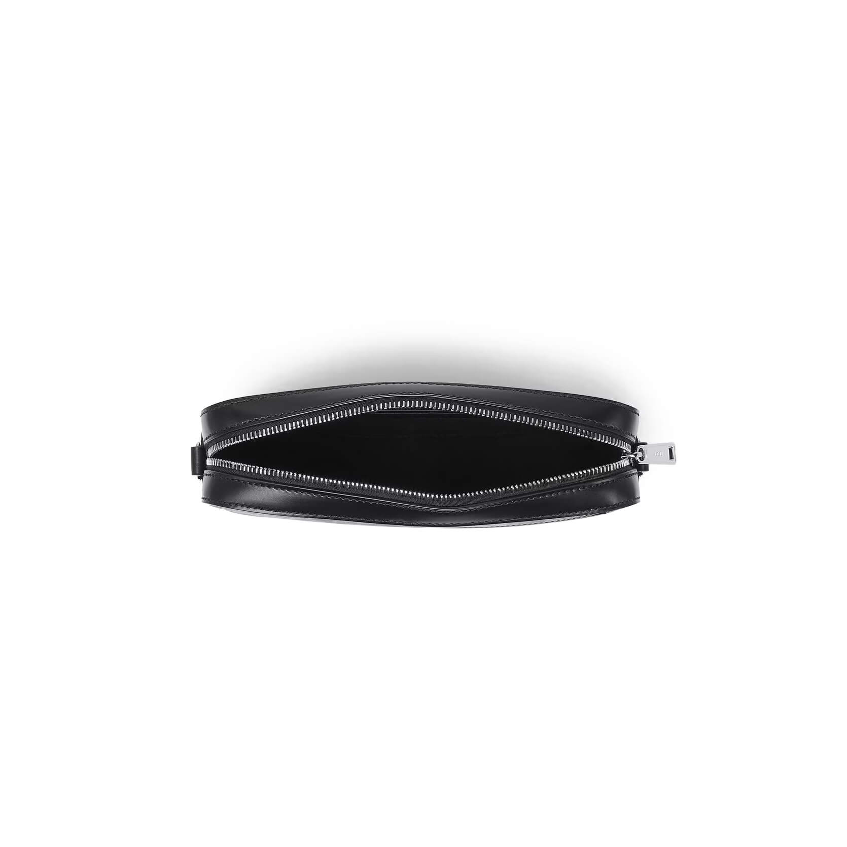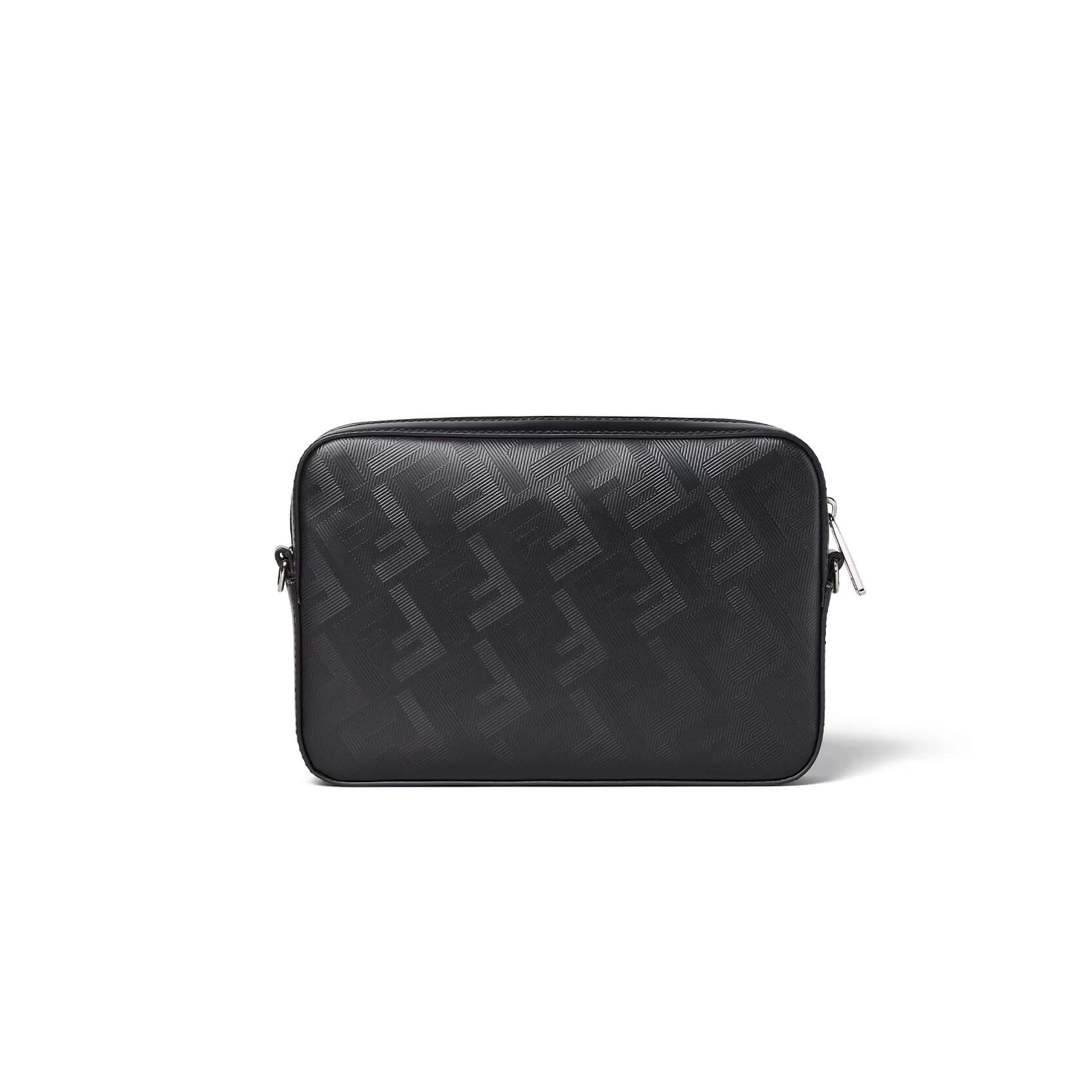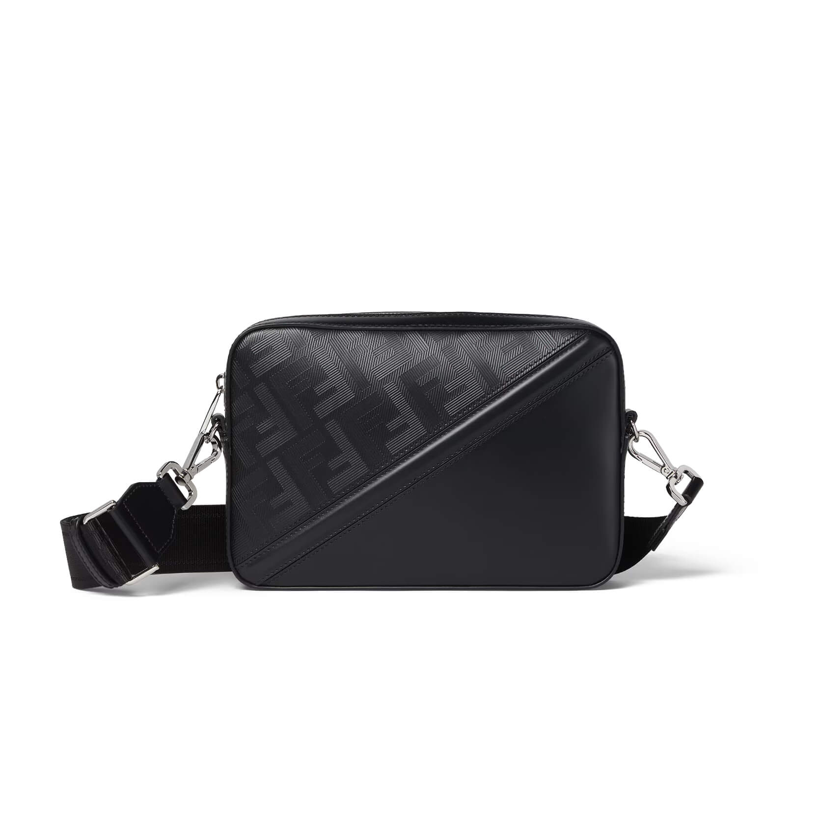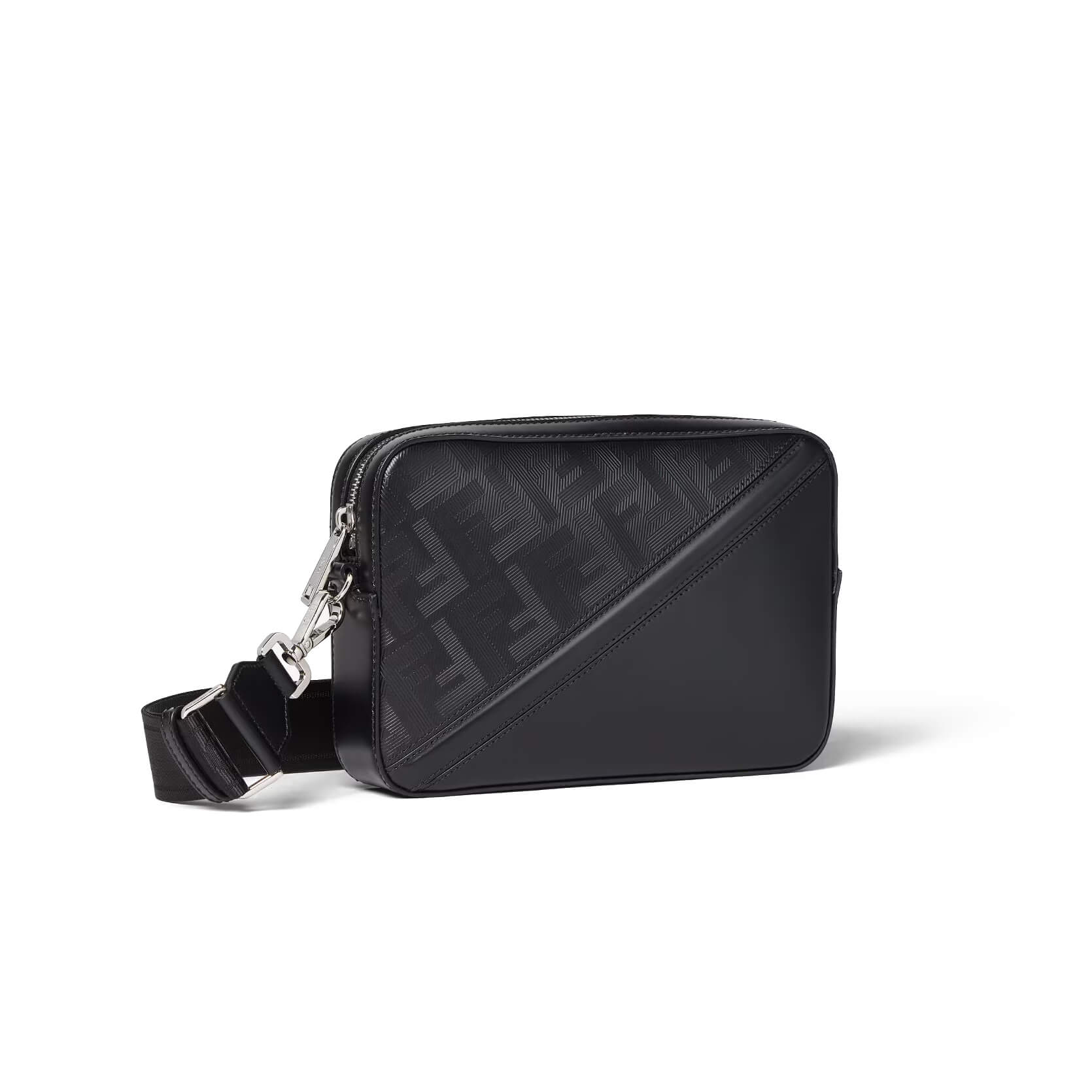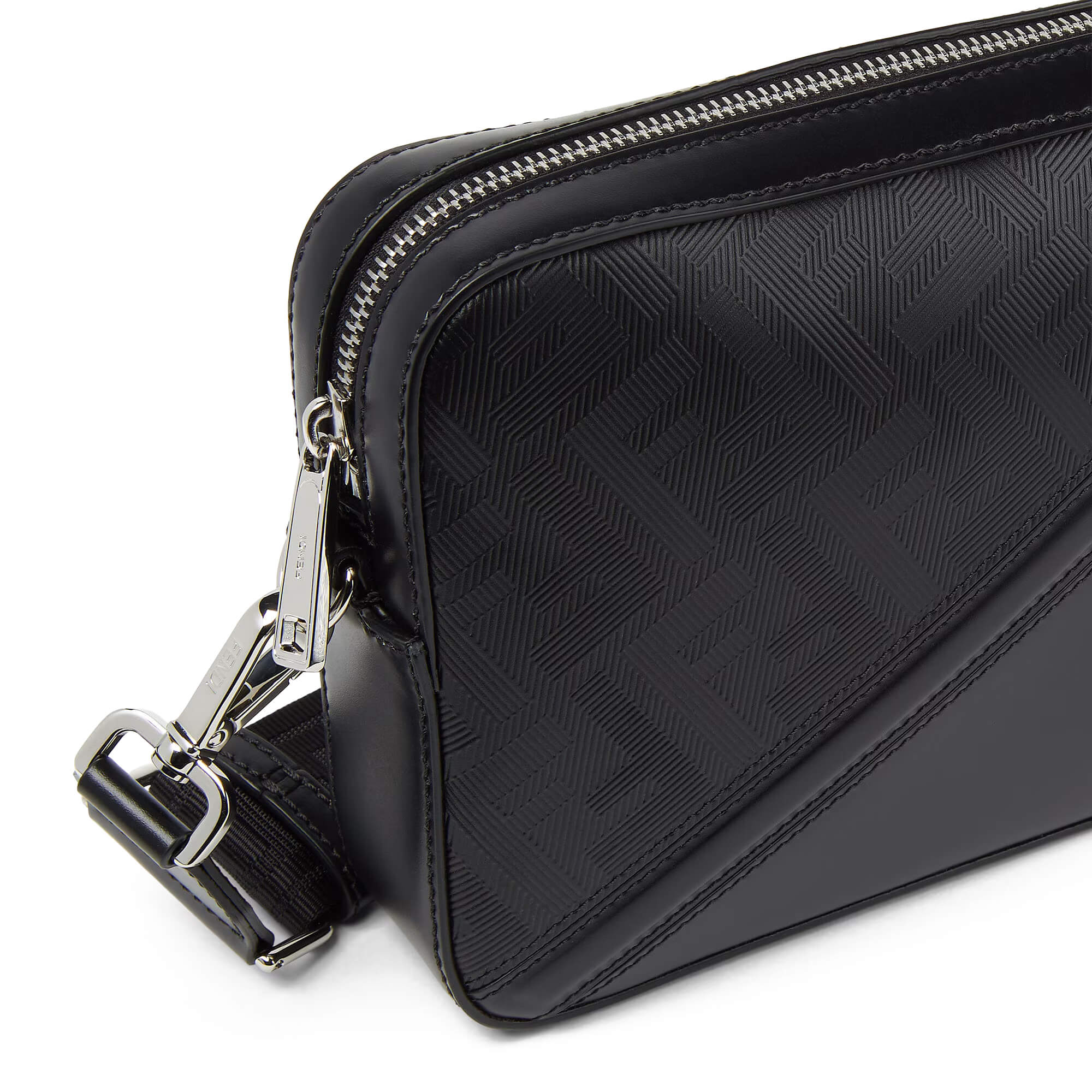 תיק קטן מעור שחור חלק ועור עם טקסטורה בדוגמת FF עם חיתוך אלכסוני