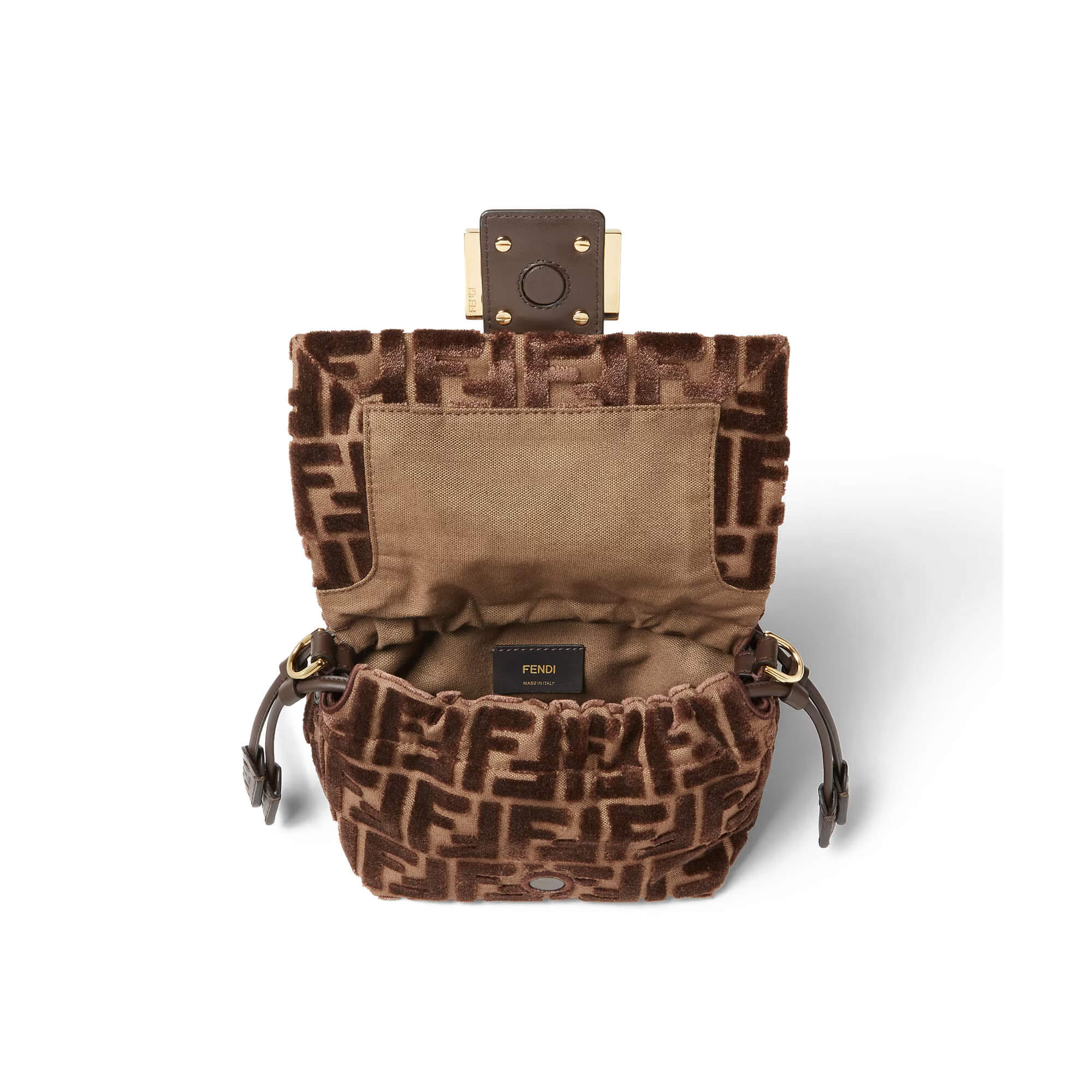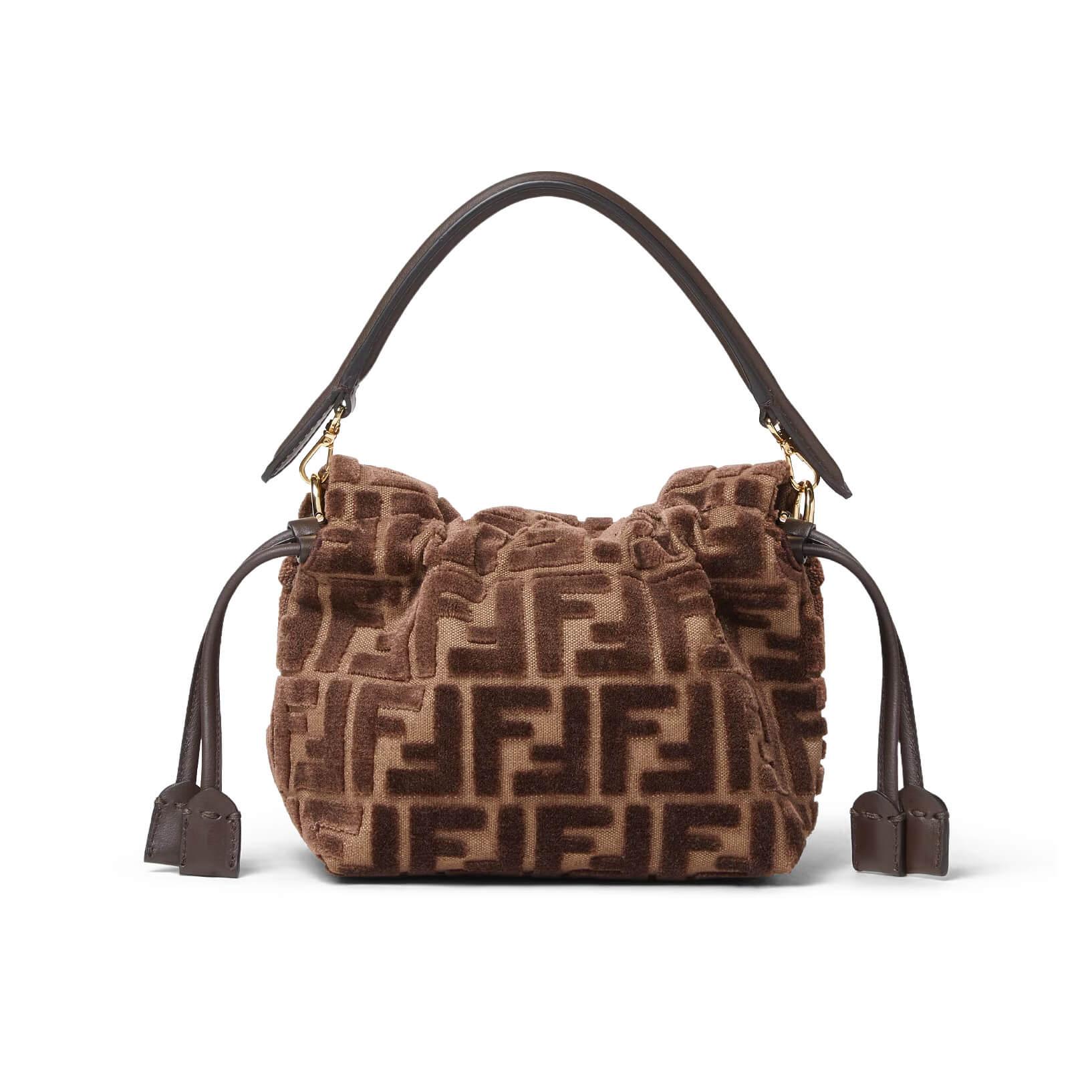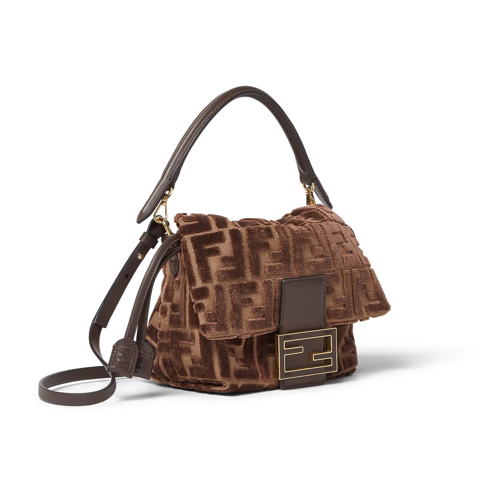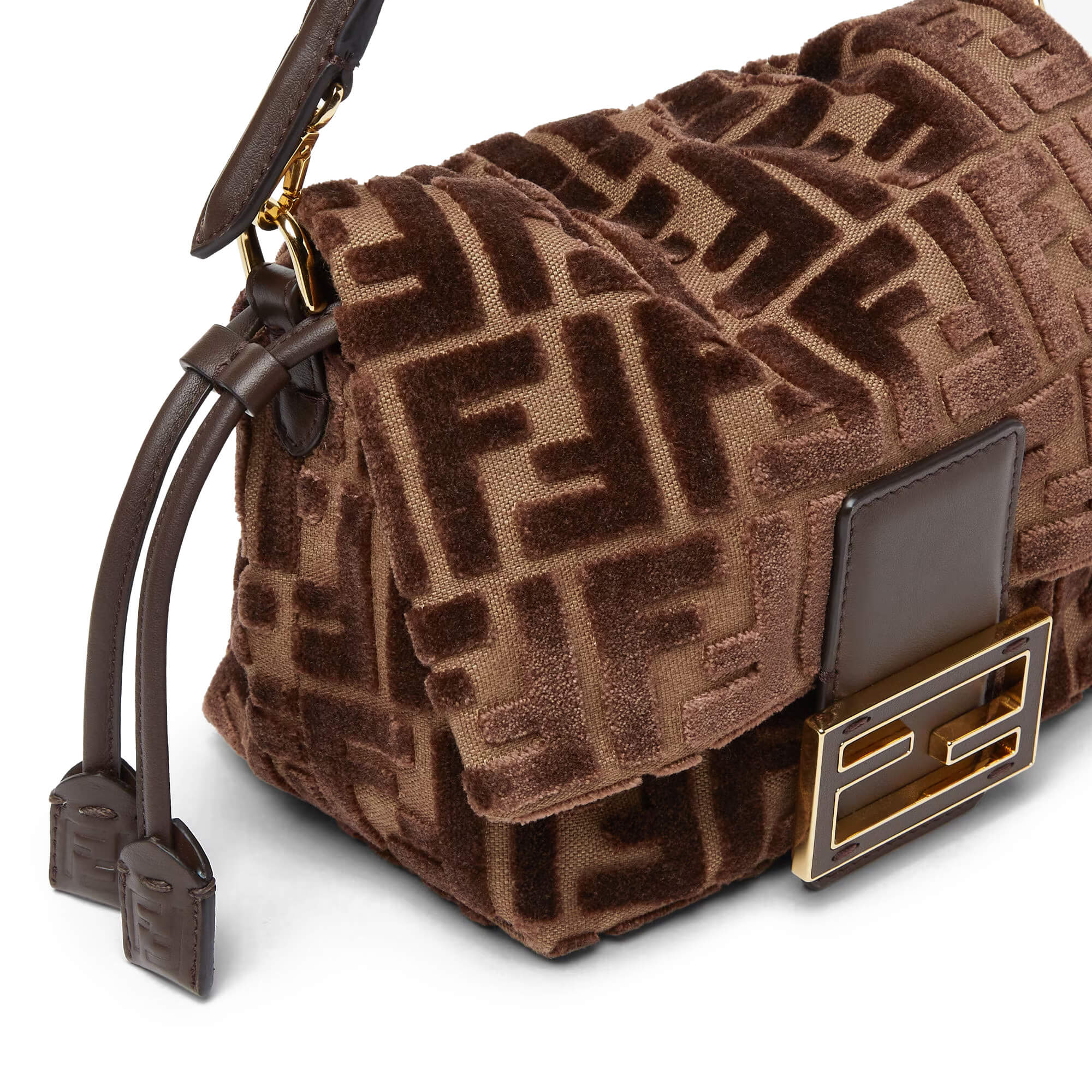 עשוי מקטיפת jacquard עם דוגמת FF מובלטת בצבע חום כהה על רקע חום