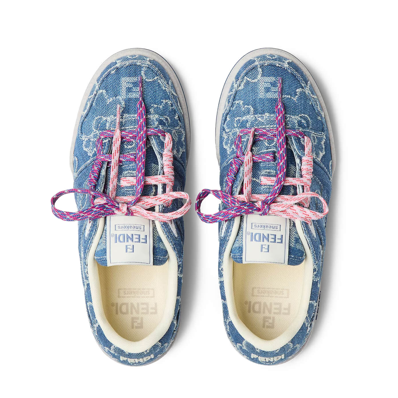 אריג FF בז׳קארד בצבע כחול במראה דנים, עם טקסטורת פרחים