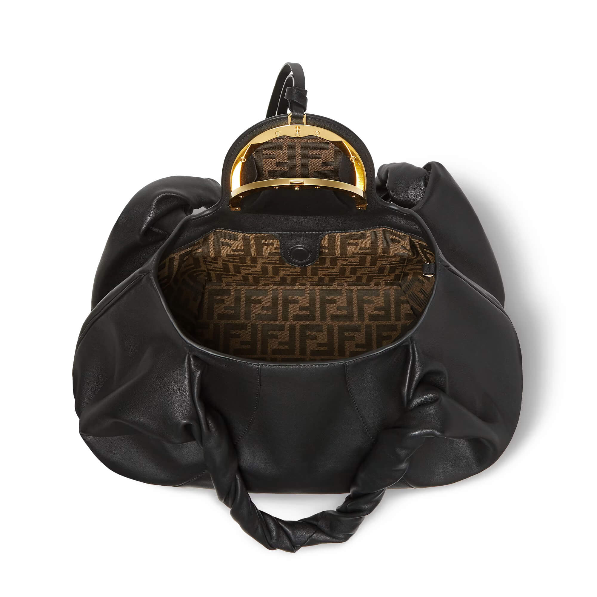 תא פנימי מרופד באריג FF jacquard בצבע חום טבק, כולל כיס לכרטיסים, טבעת לחיבור קישוטים או מחזיק מפתחות