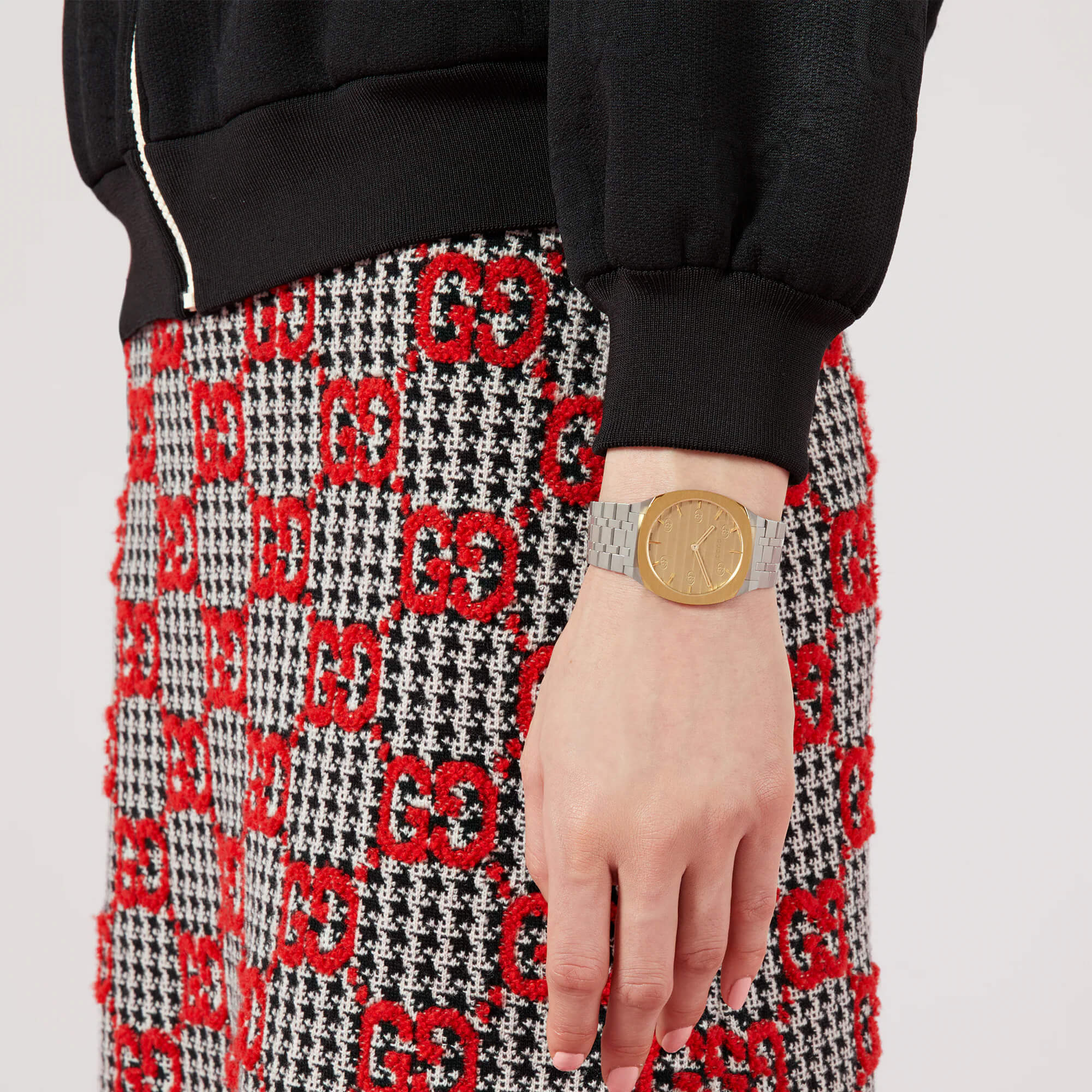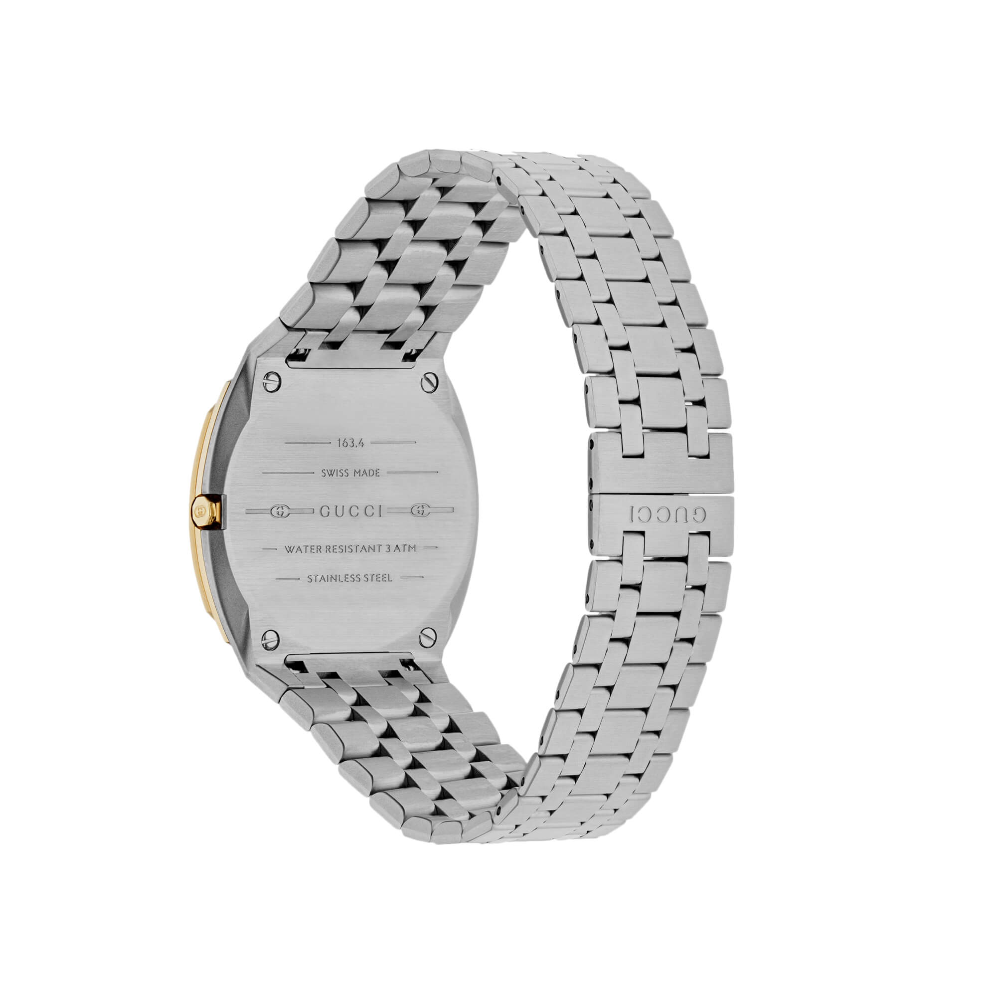 34mm stainless steel and 18k yellow gold plated multi-layered case, golden brass dial with Interlocking G motif, five link stainless steel bracelet