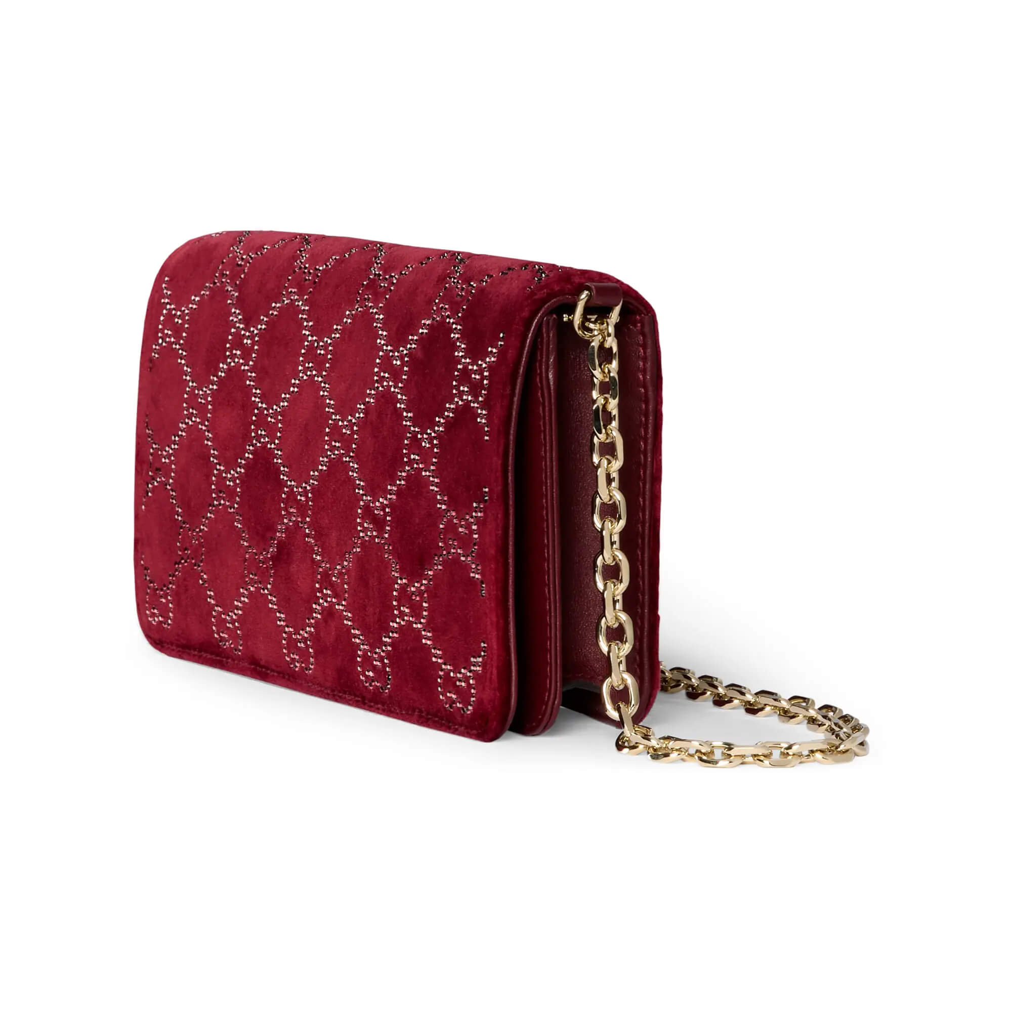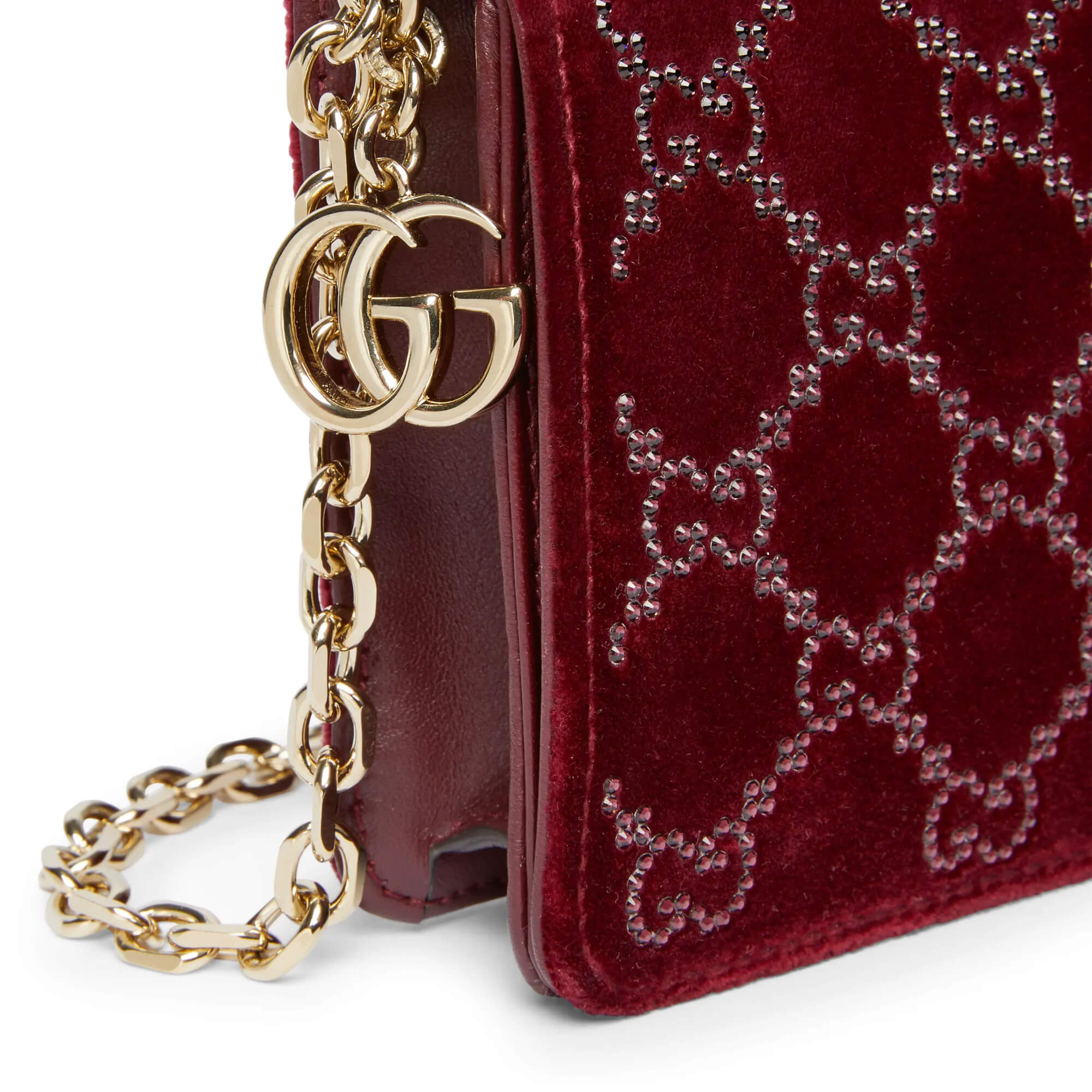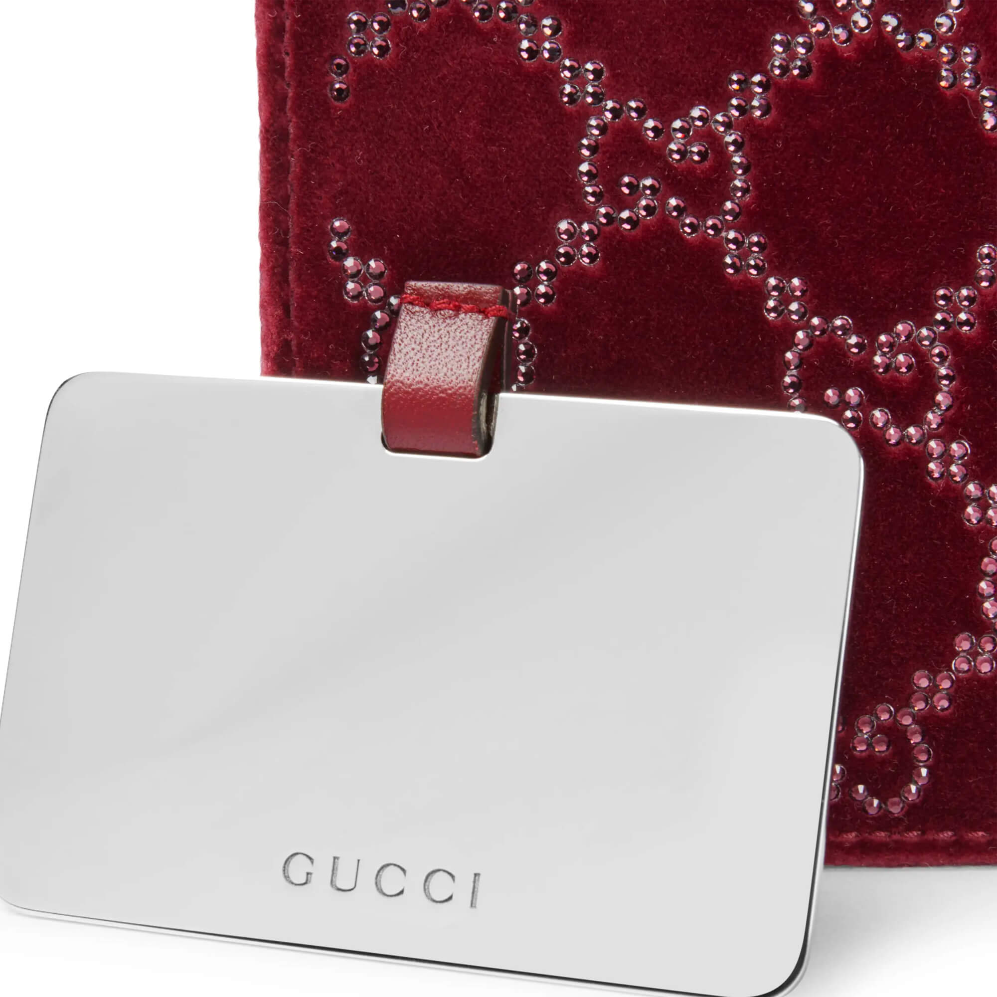 עשוי מקטיפה בצבע אדום Rosso Ancora עם קריסטלים בדוגמת GG