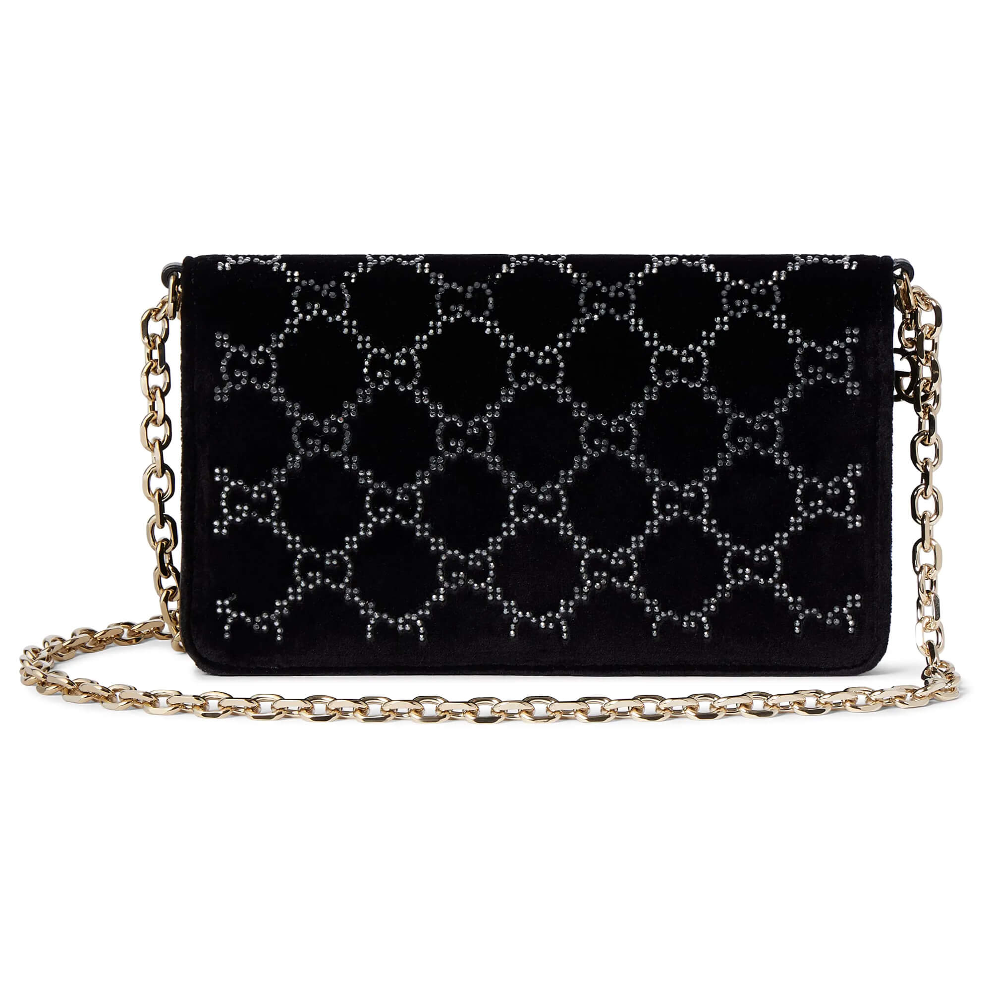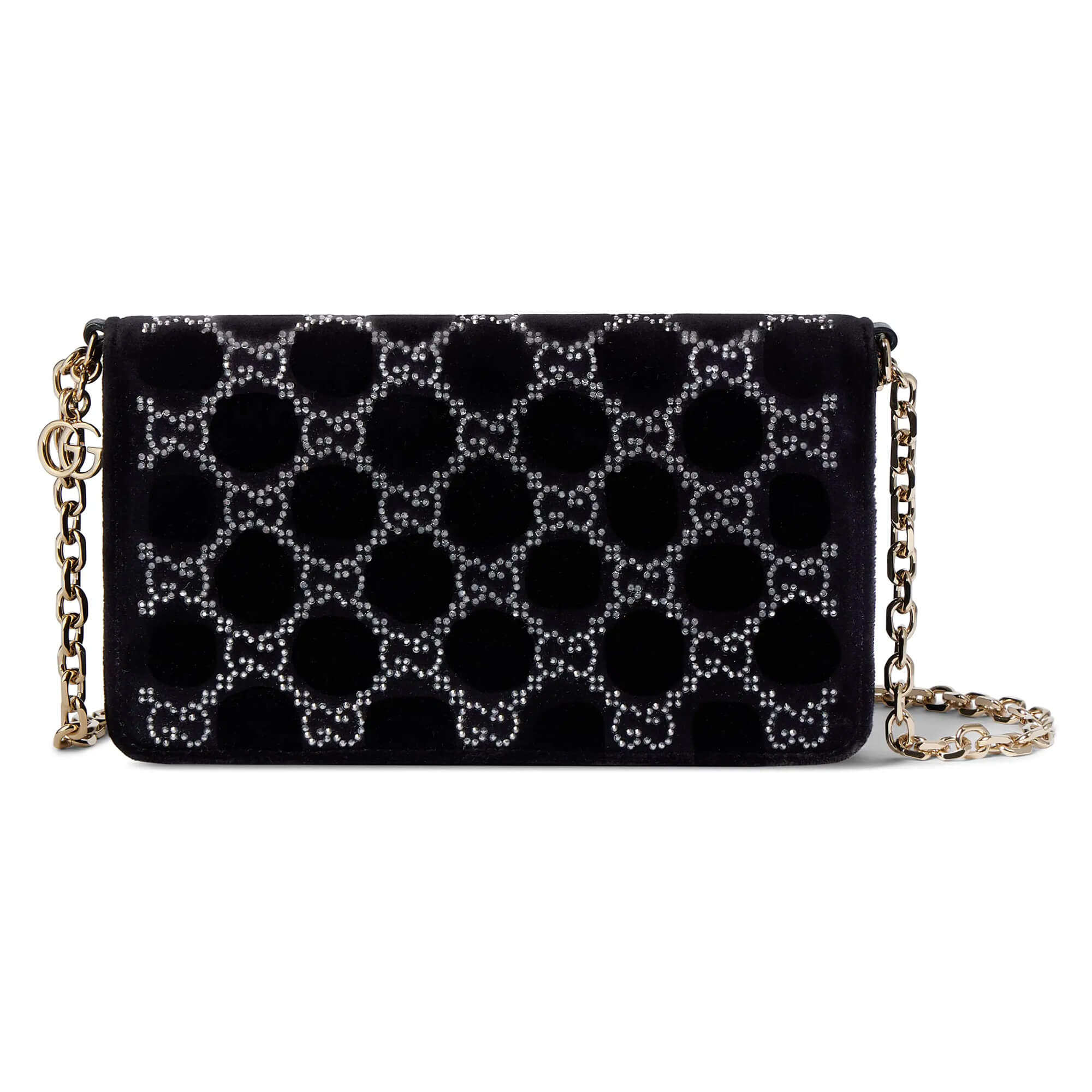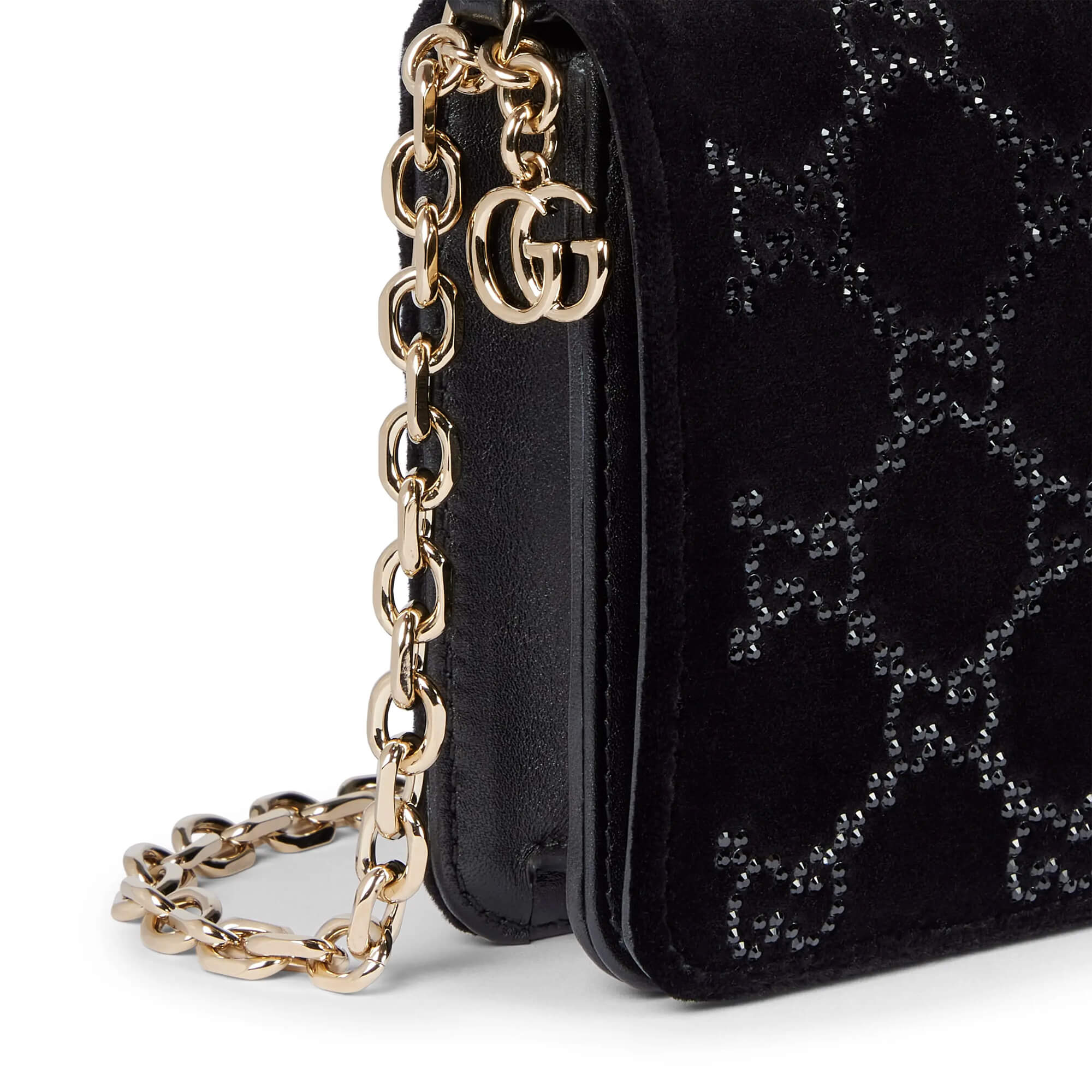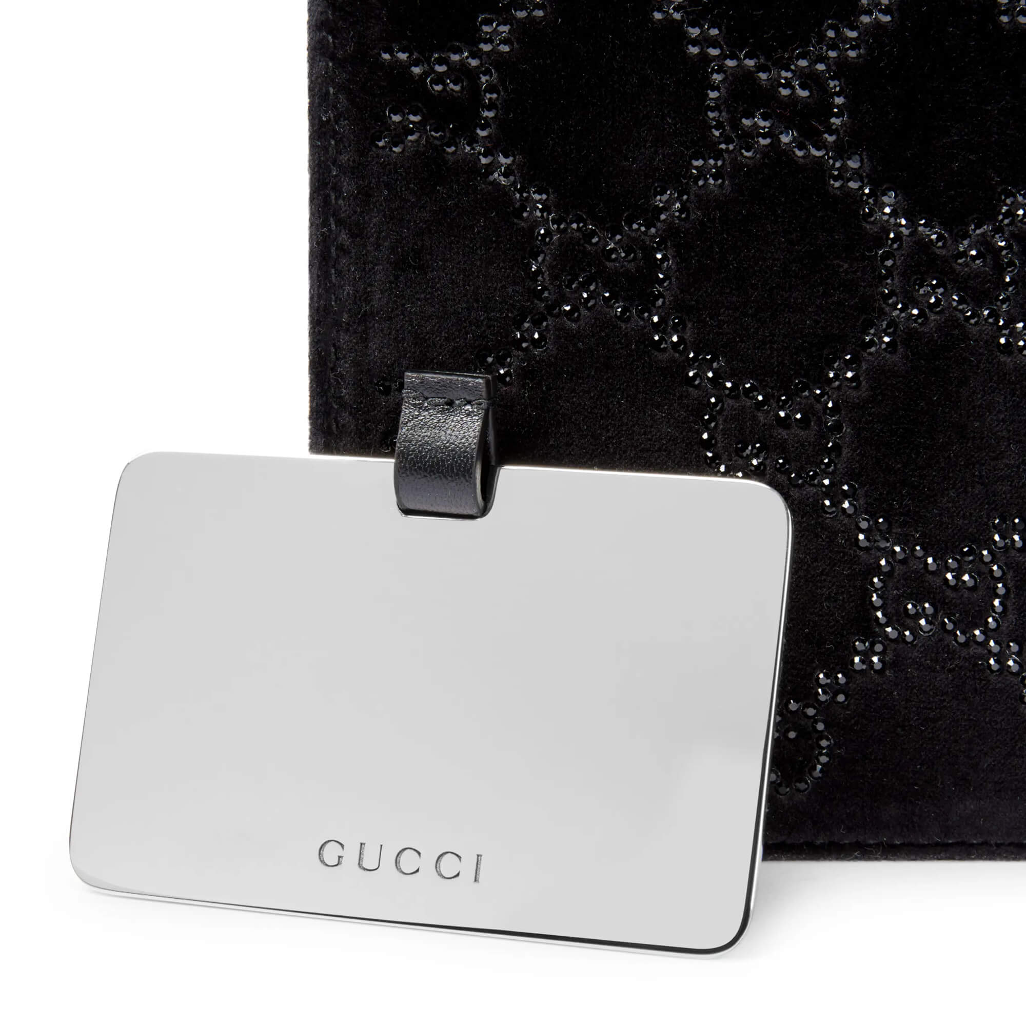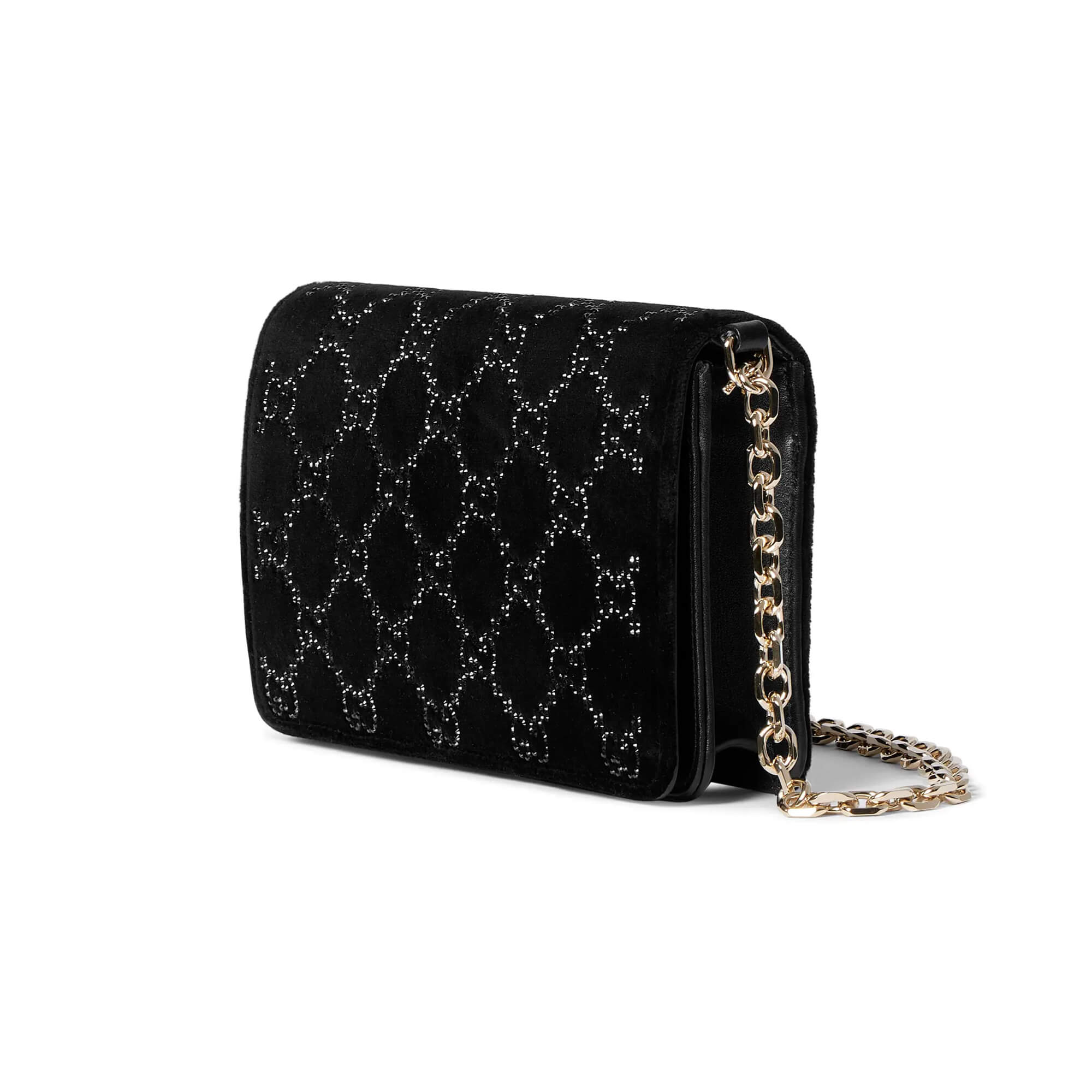 עשוי מקטיפה בצבע שחור עם קריסטלים בדוגמת GG פנים התיק: עור שחור אביזרים בצבע זהב בהיר בטנה בצבע שחור בתוך התיק: מראה נשלפת בכיס ייעודי וכיס פתוח אחד רצועת כתף משרשרת ; גובה: 50 ס״מ סגירה מגנטית רוחב: 20 ס״מ גובה: 11.5 ס״מ עומק: 4.5 ס״מ משקל: כ־475 גרם מיוצר באיטליה