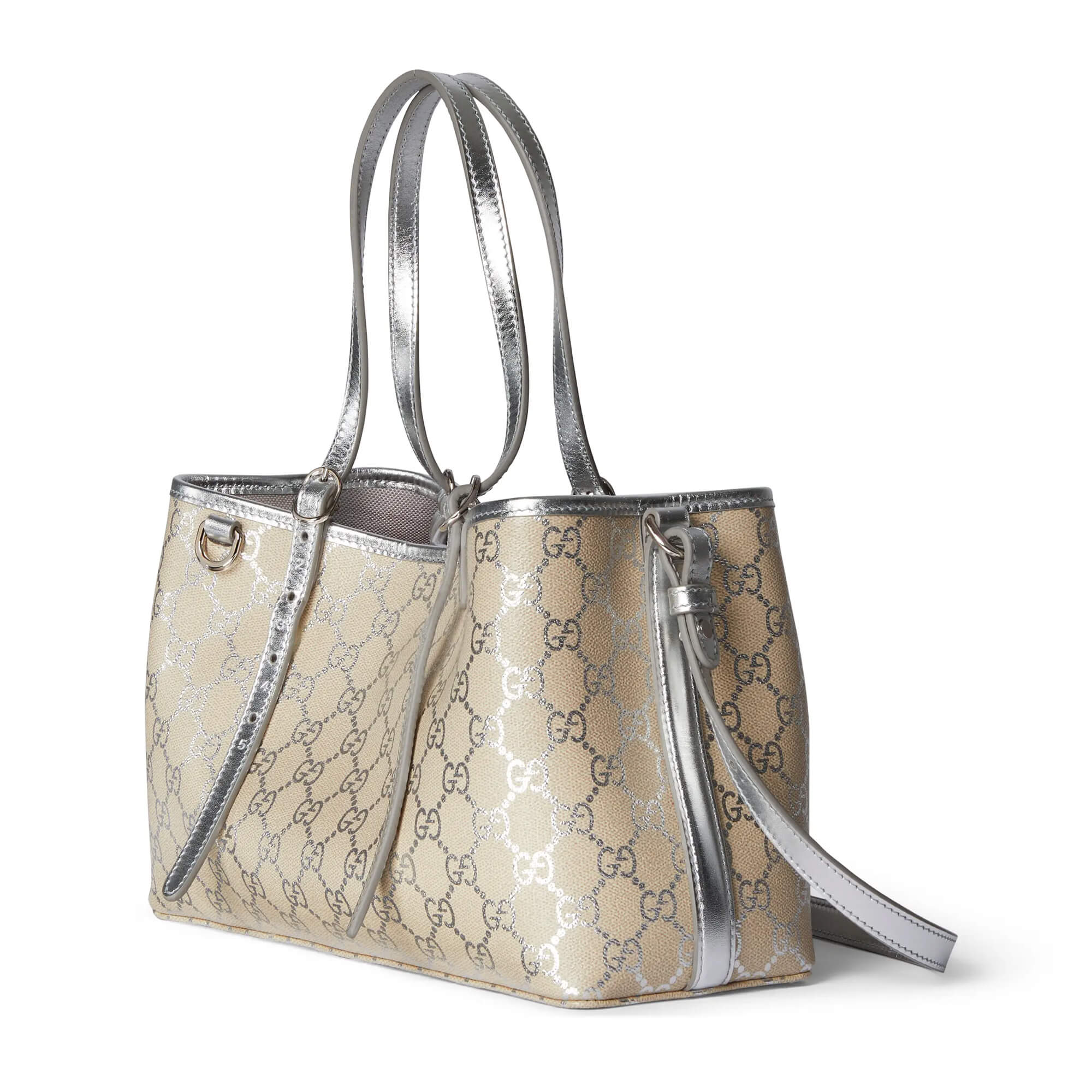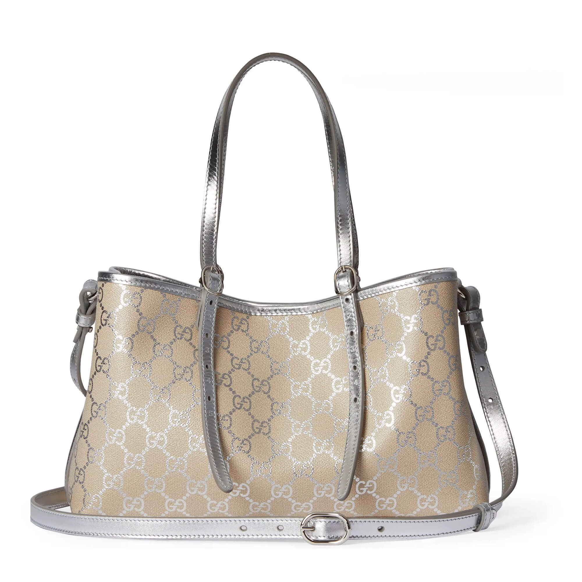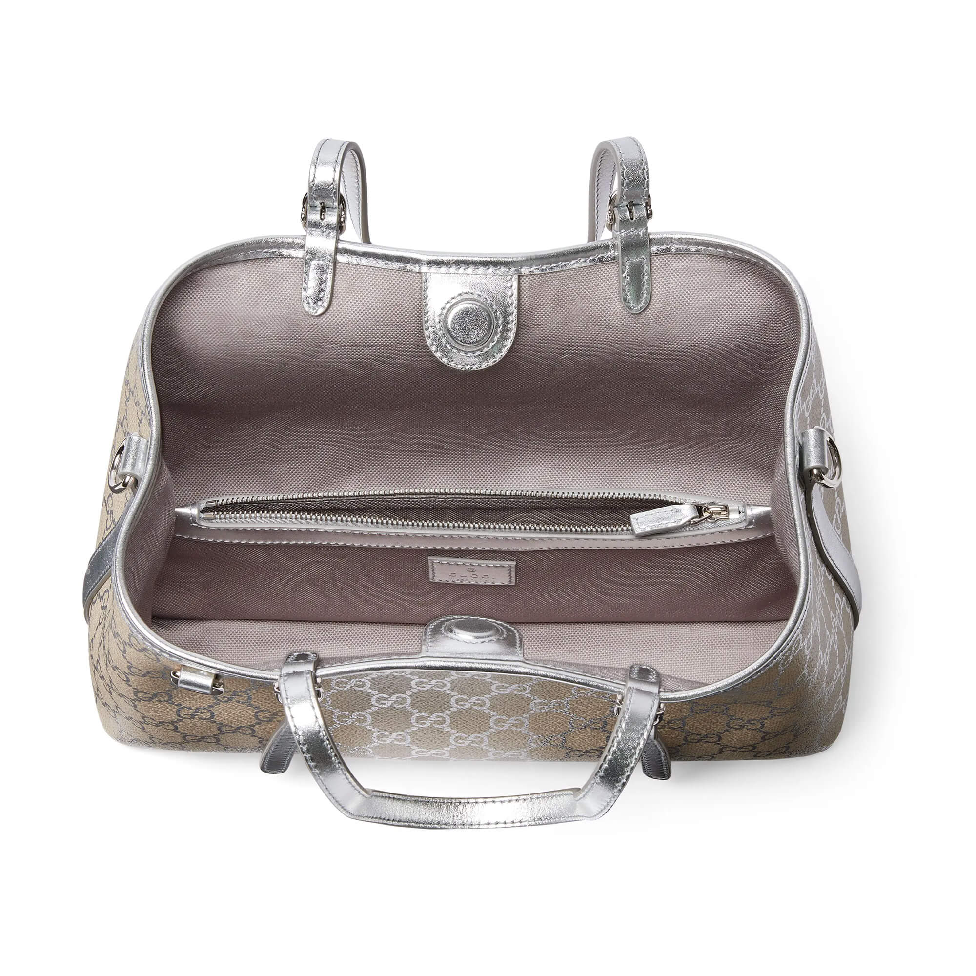 אריג GG Monogram בגימור למינציה בצבע בז׳ בהיר וכסף מטאלי
