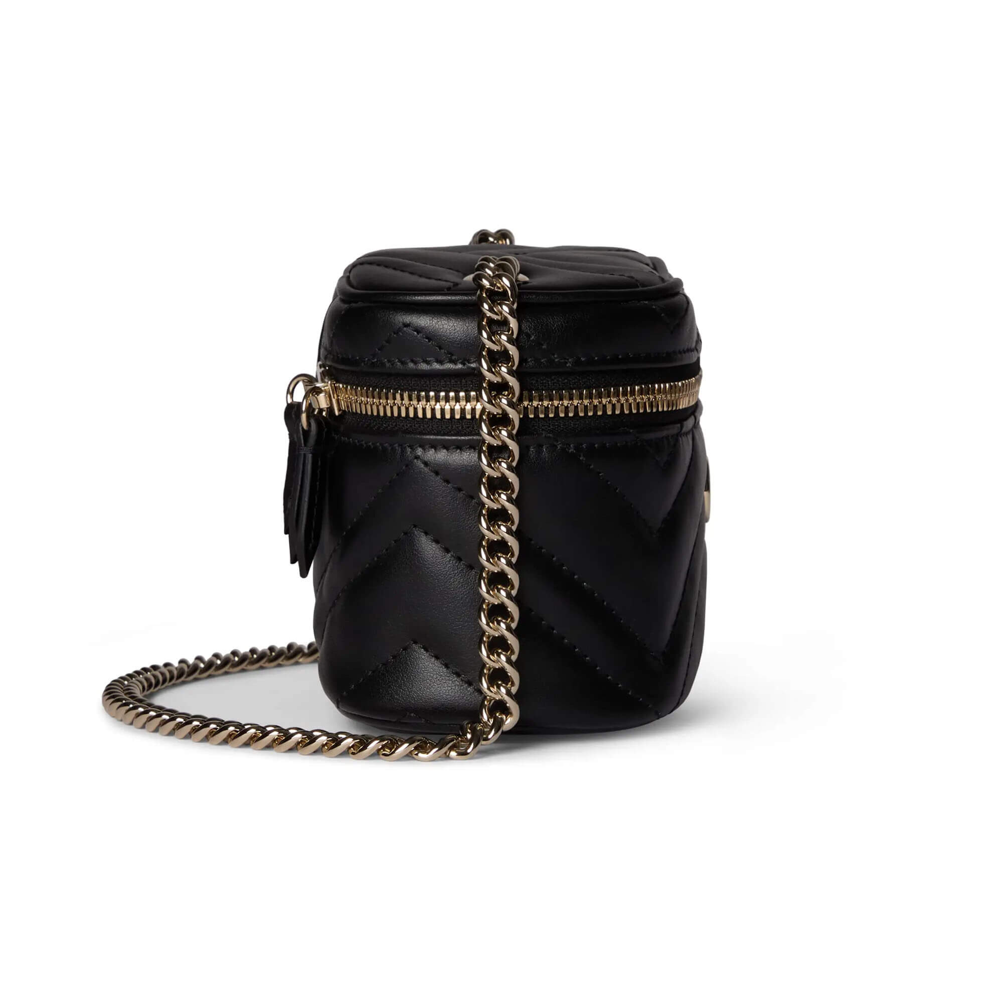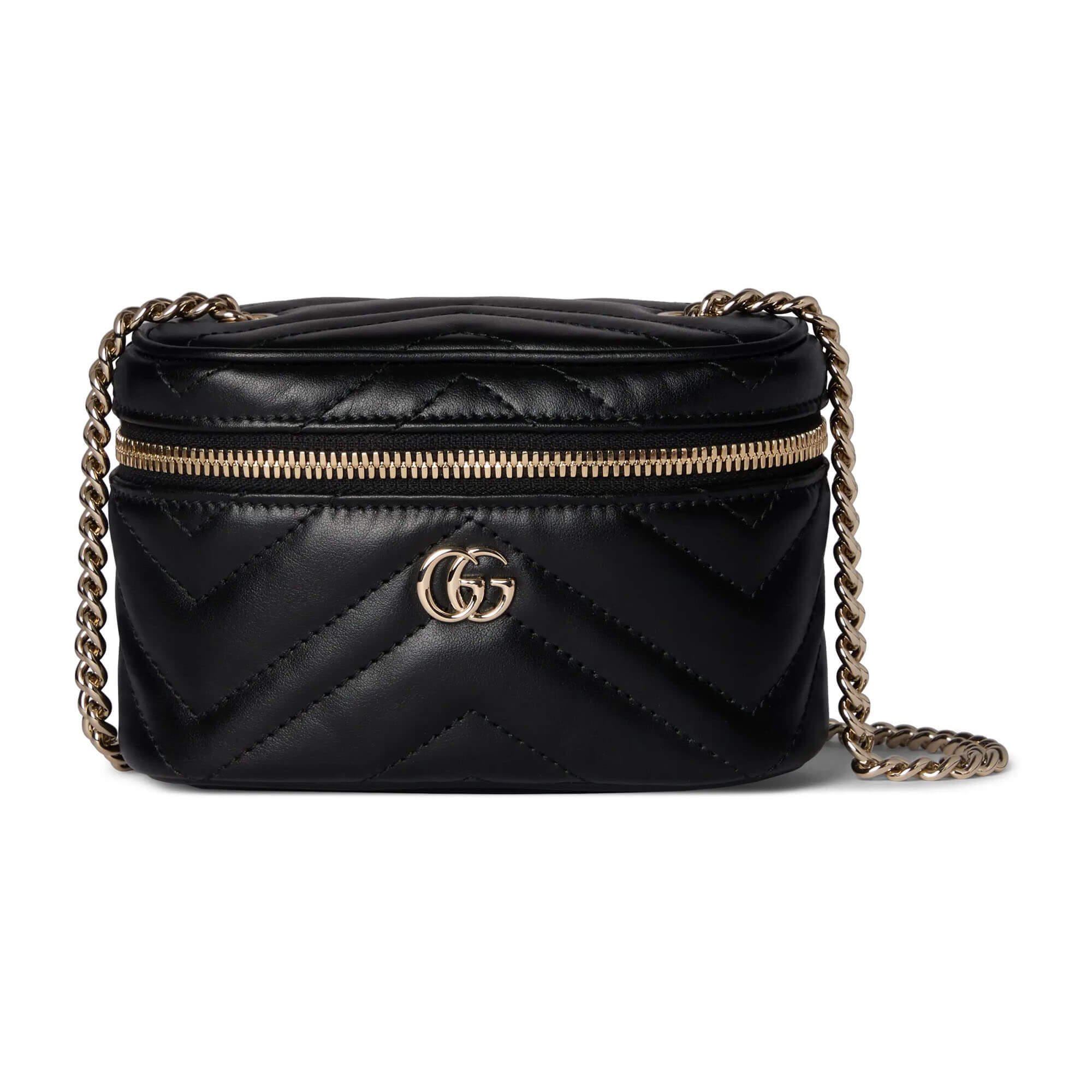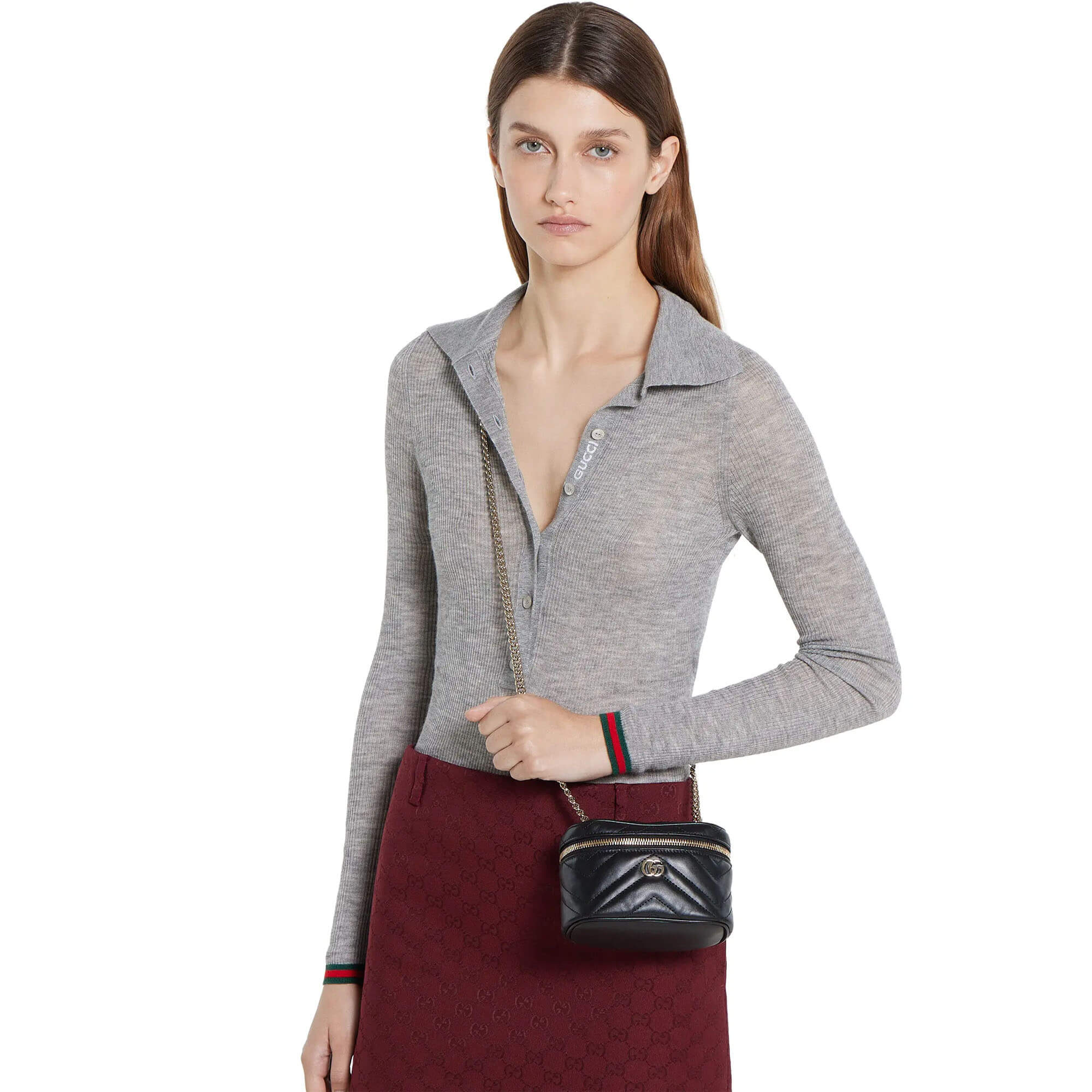 תיק מיני מעור matelassé chevron שחור אביזרים בצבע זהב בהיר בטנת טאפטה שחורה עיטור Double G רצועת כתף משרשרת: גובה 50 ס״מ סגירת רוכסן רוחב: 15 ס״מ גובה: 8 ס״מ עומק: 8.5 ס״מ משקל: כ־0.227 ק״ג מתאים ל־iPhone Pro Max / Plus, AirPods, נרתיק כרטיסים ואודםכגעיכי