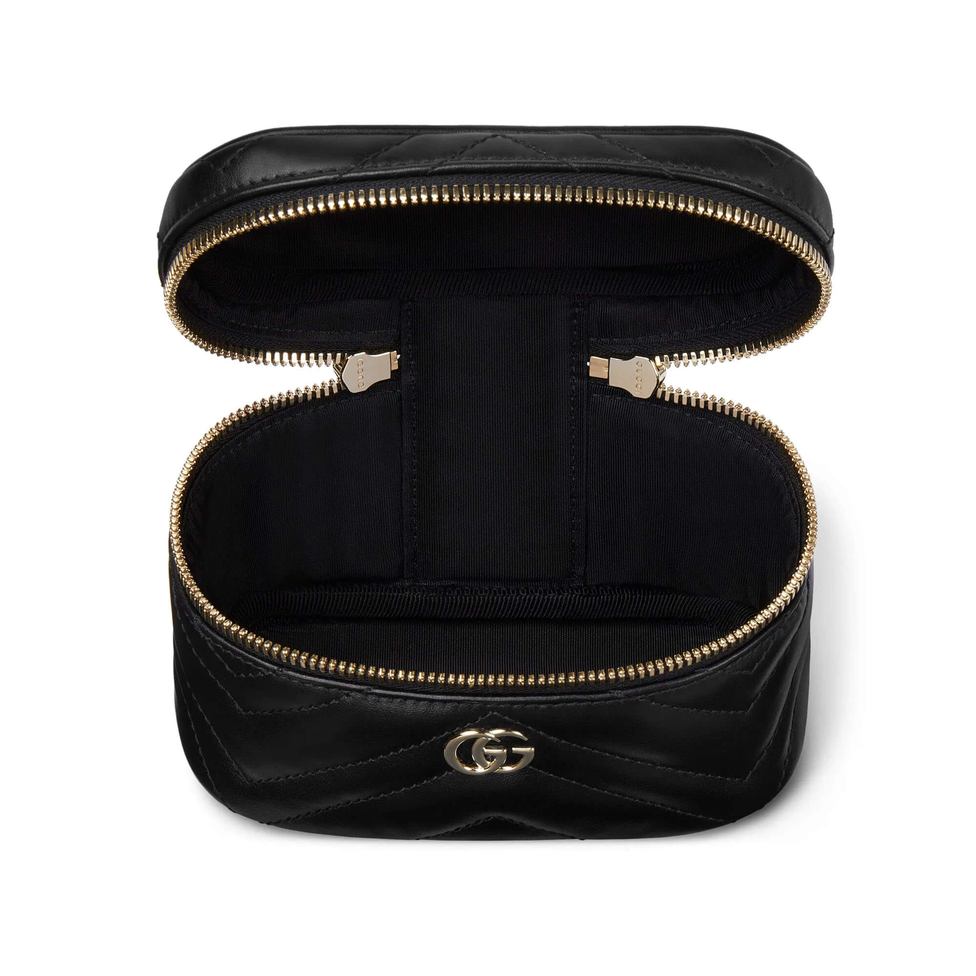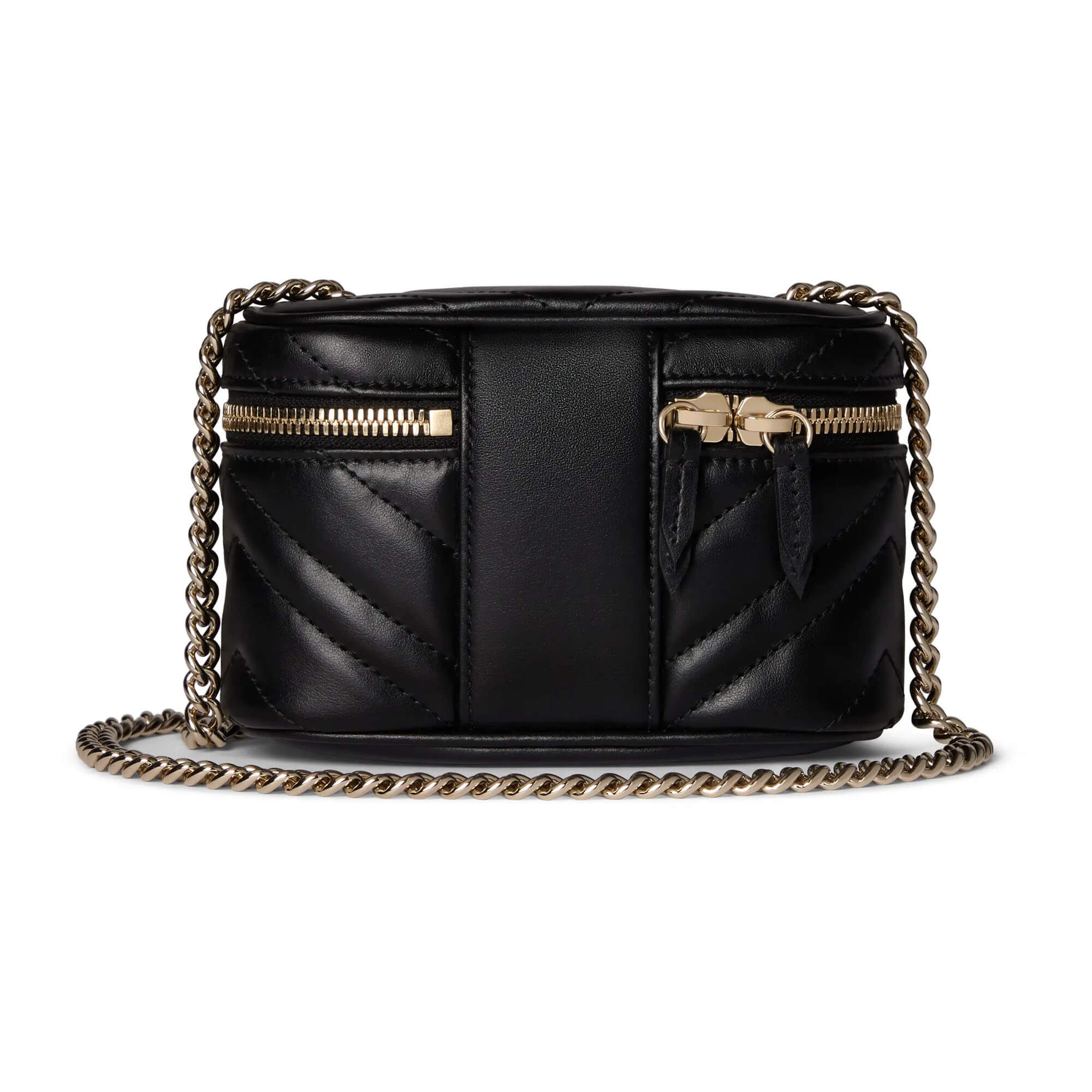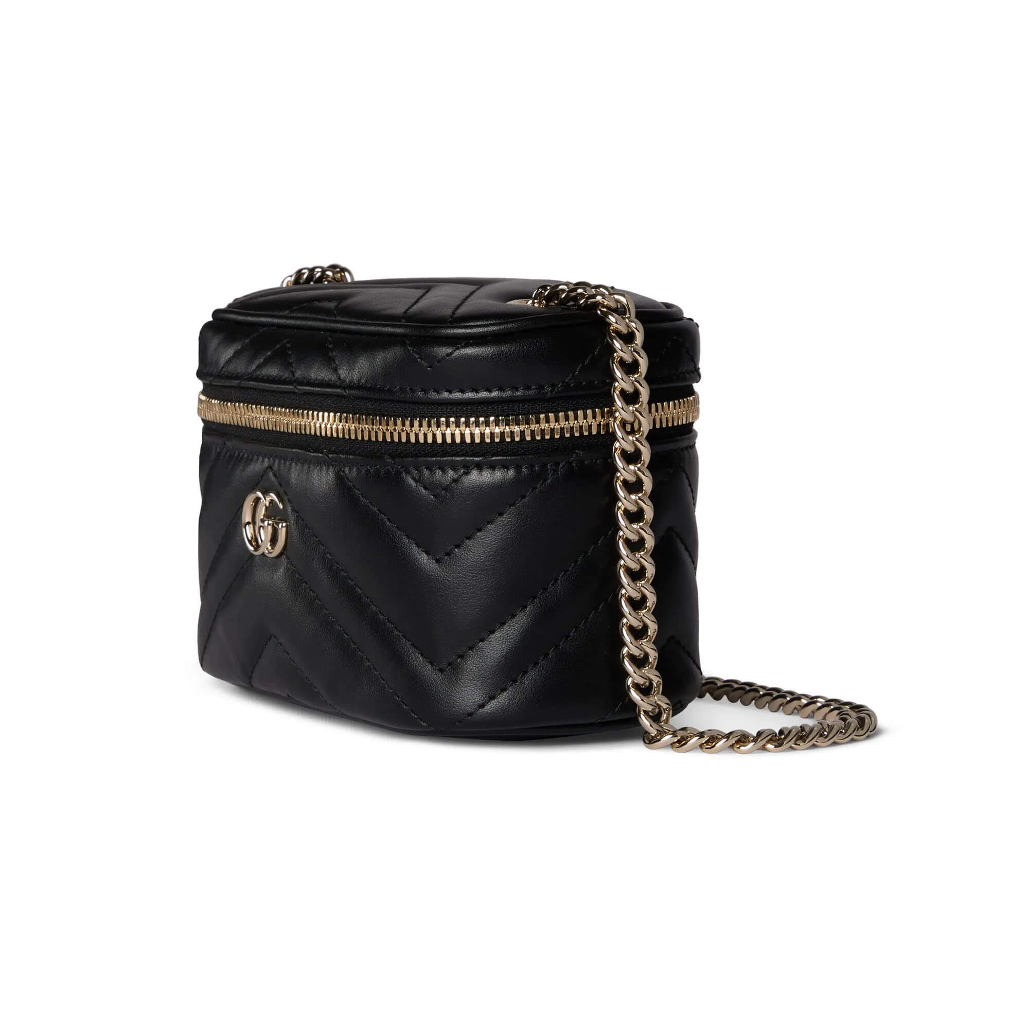 תיק מיני מעור matelassé chevron שחור אביזרים בצבע זהב בהיר בטנת טאפטה שחורה עיטור Double G רצועת כתף משרשרת: גובה 50 ס״מ סגירת רוכסן רוחב: 15 ס״מ גובה: 8 ס״מ עומק: 8.5 ס״מ משקל: כ־0.227 ק״ג מתאים ל־iPhone Pro Max / Plus, AirPods, נרתיק כרטיסים ואודםכגעיכי