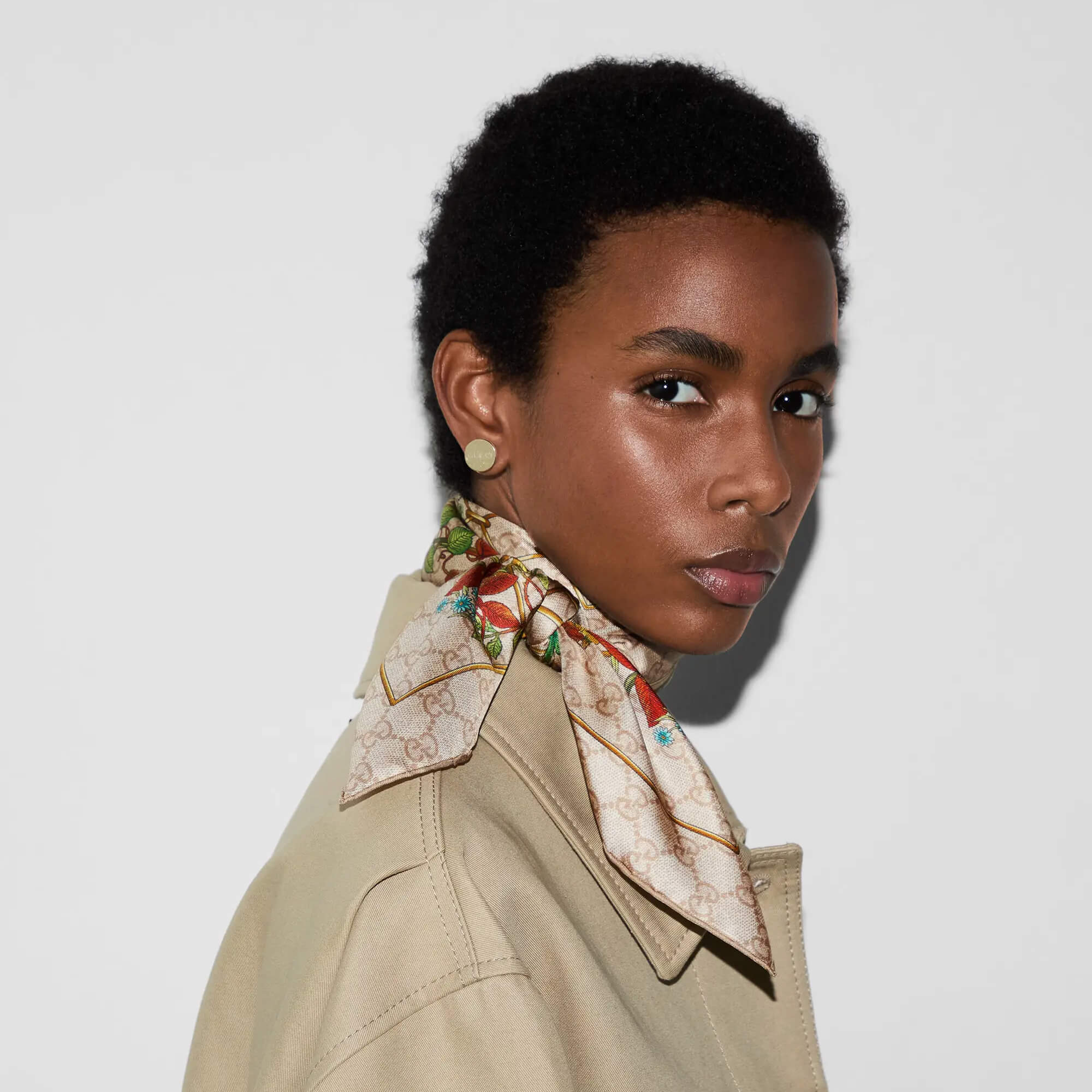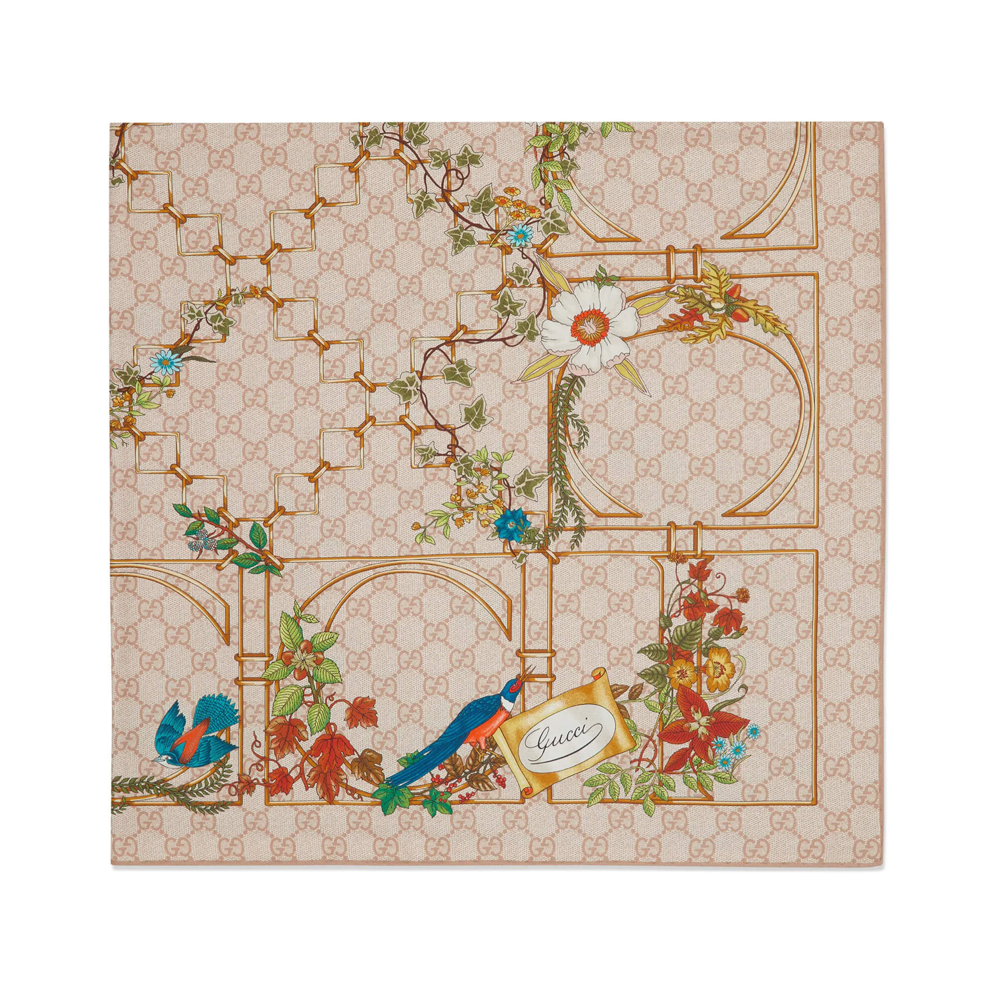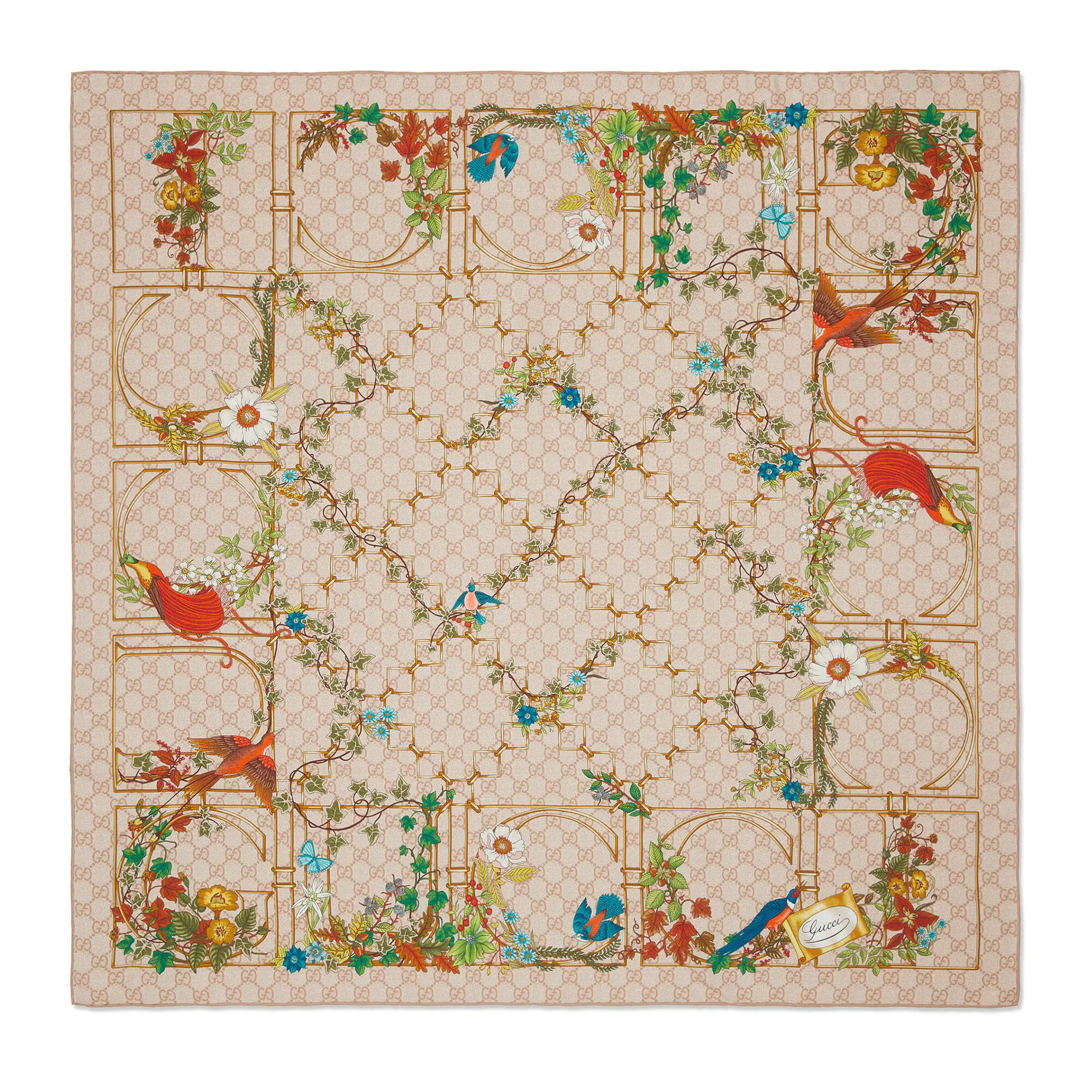 צעיף מבד משי בצבע שנהב עם הדפס Gucci צבעוני בדוגמת פרחים וחיות