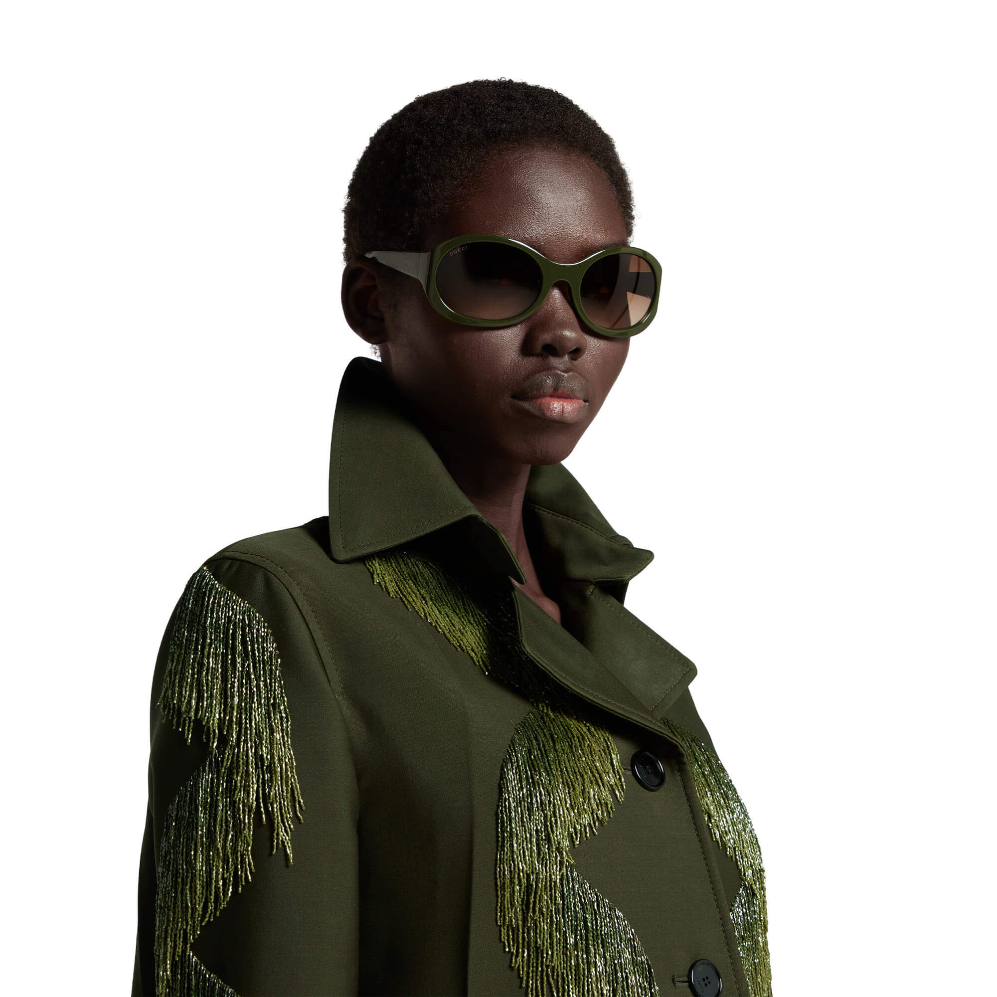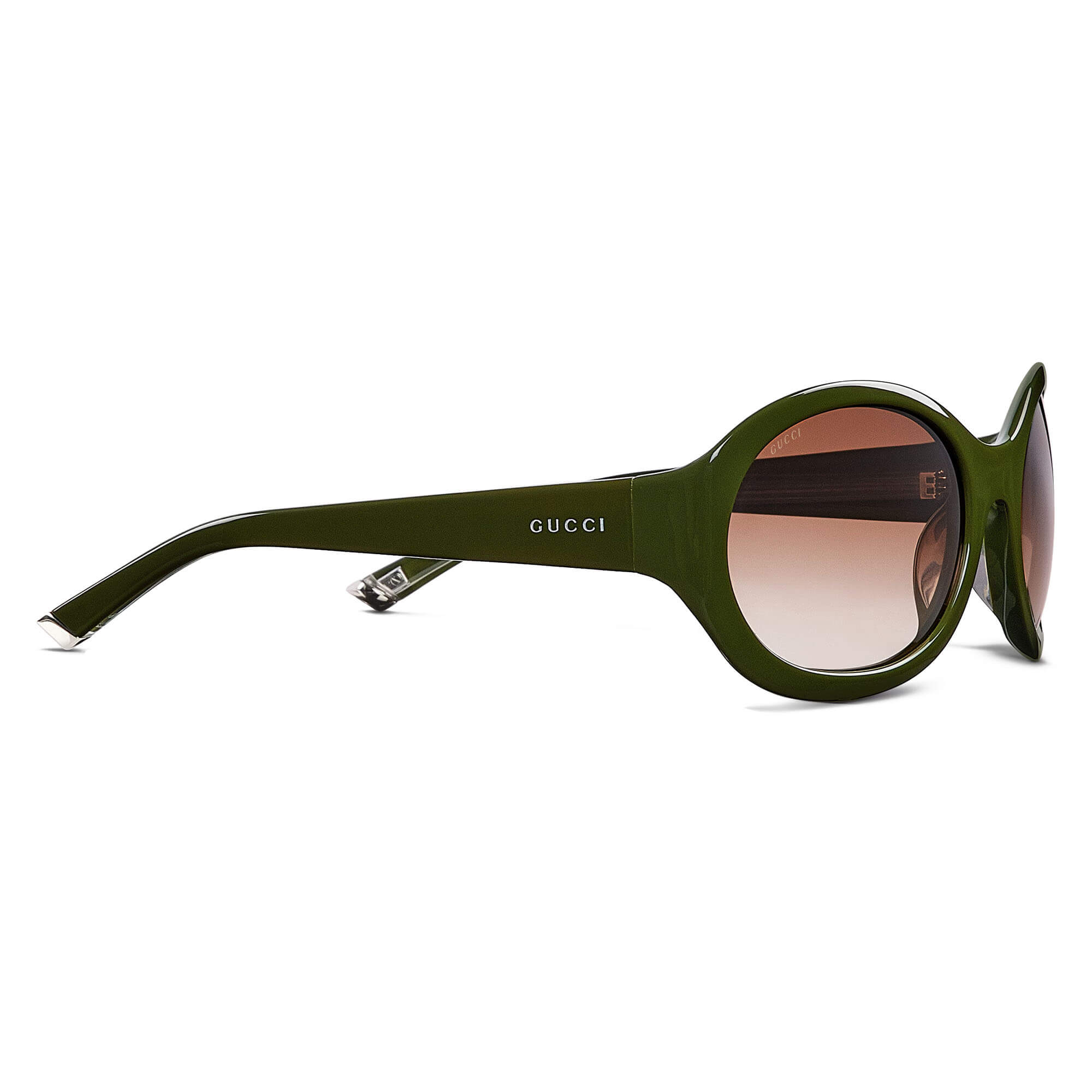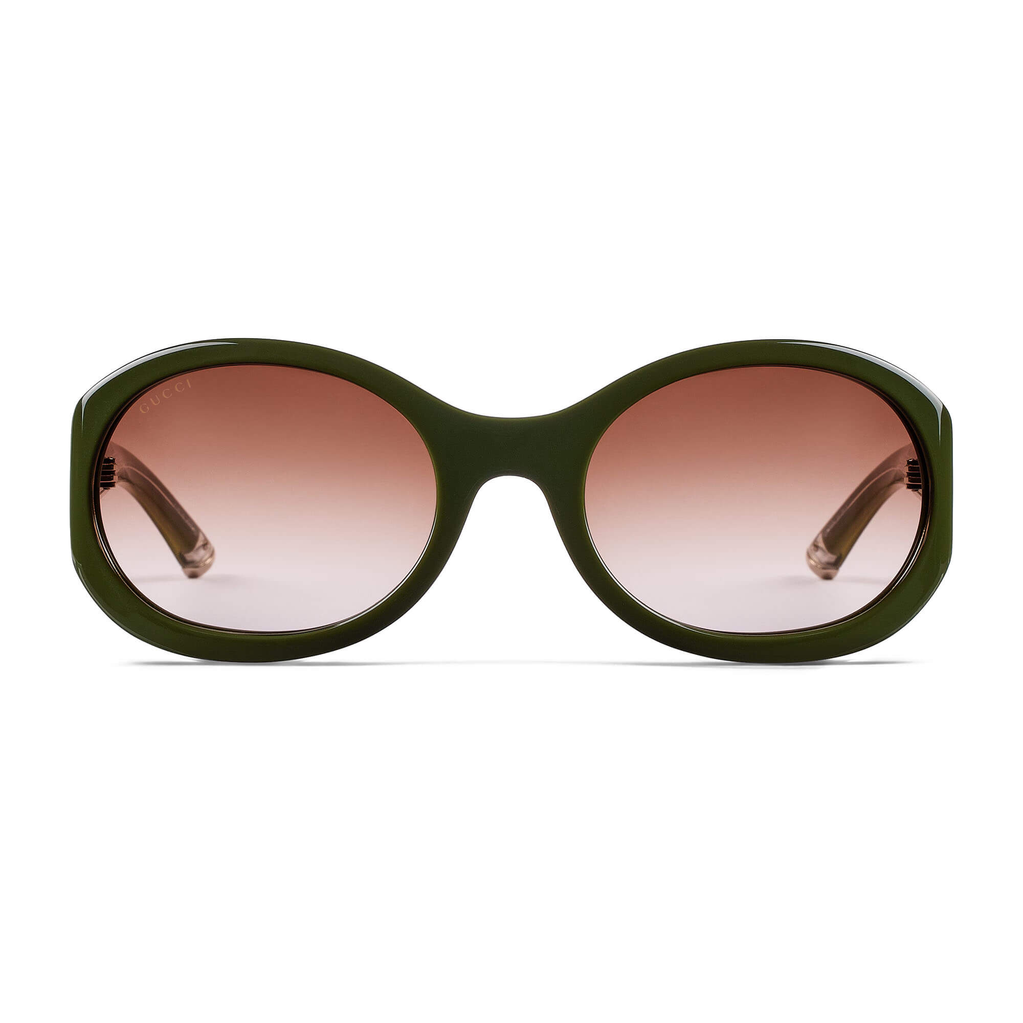 Shiny bilayer green and brown acetate temples with enameled logo and metal tips