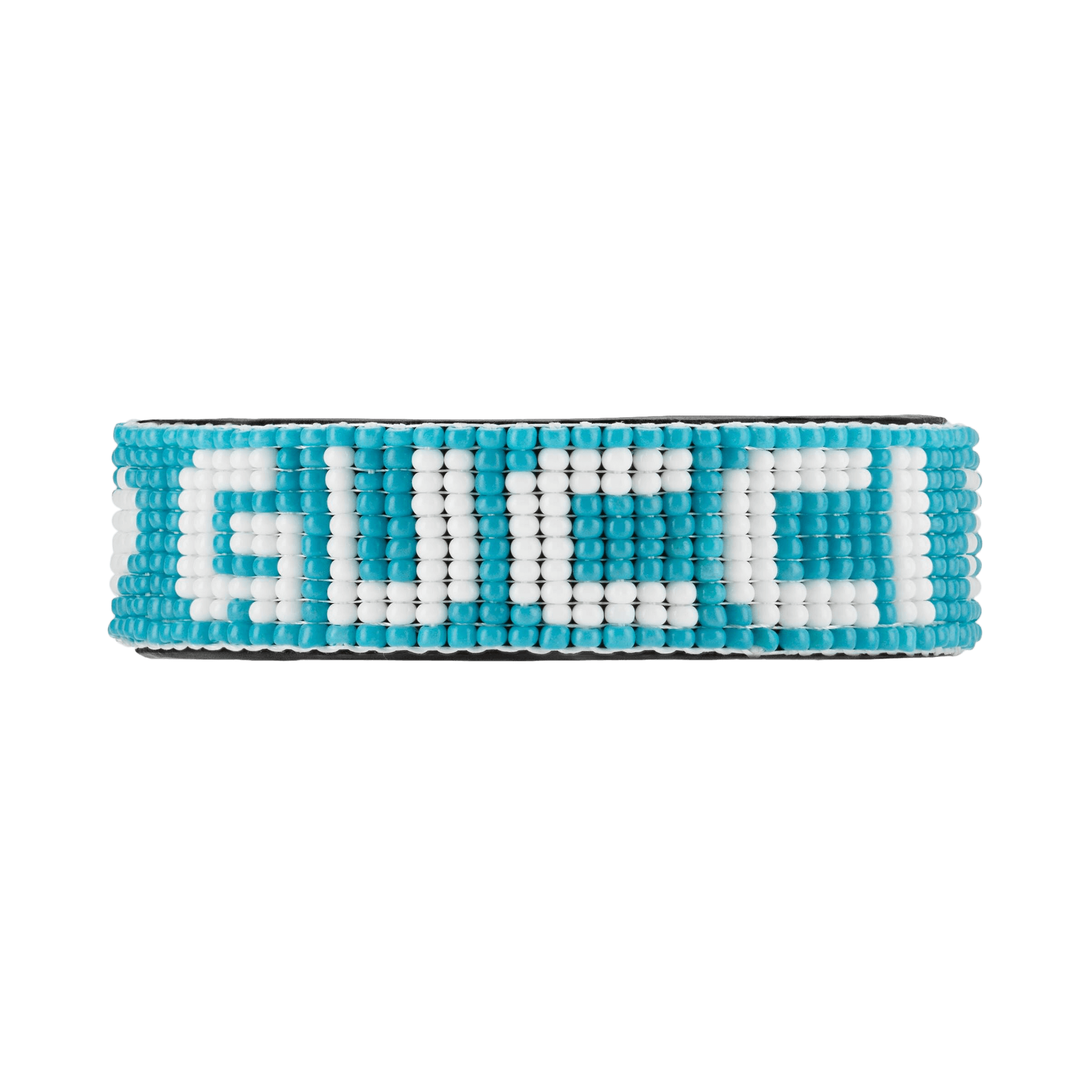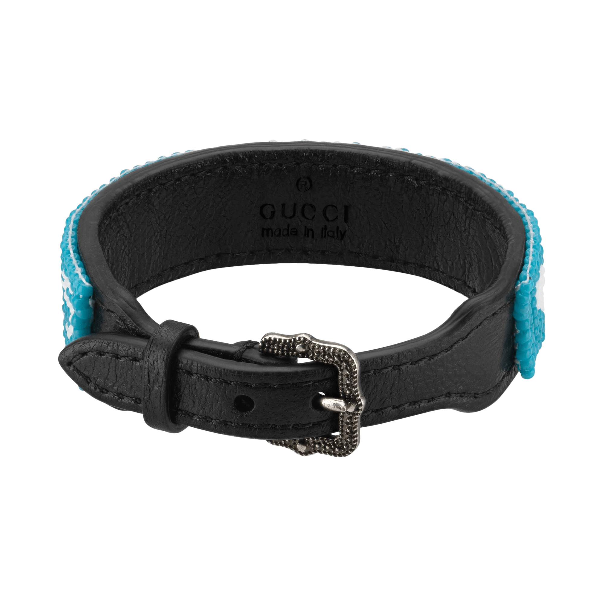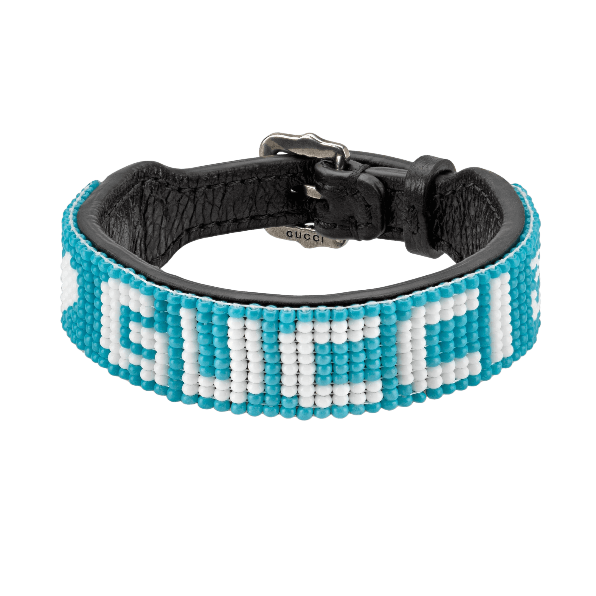 Light blue and white beads with ‘Gucci’ script, ’25’, and heart details